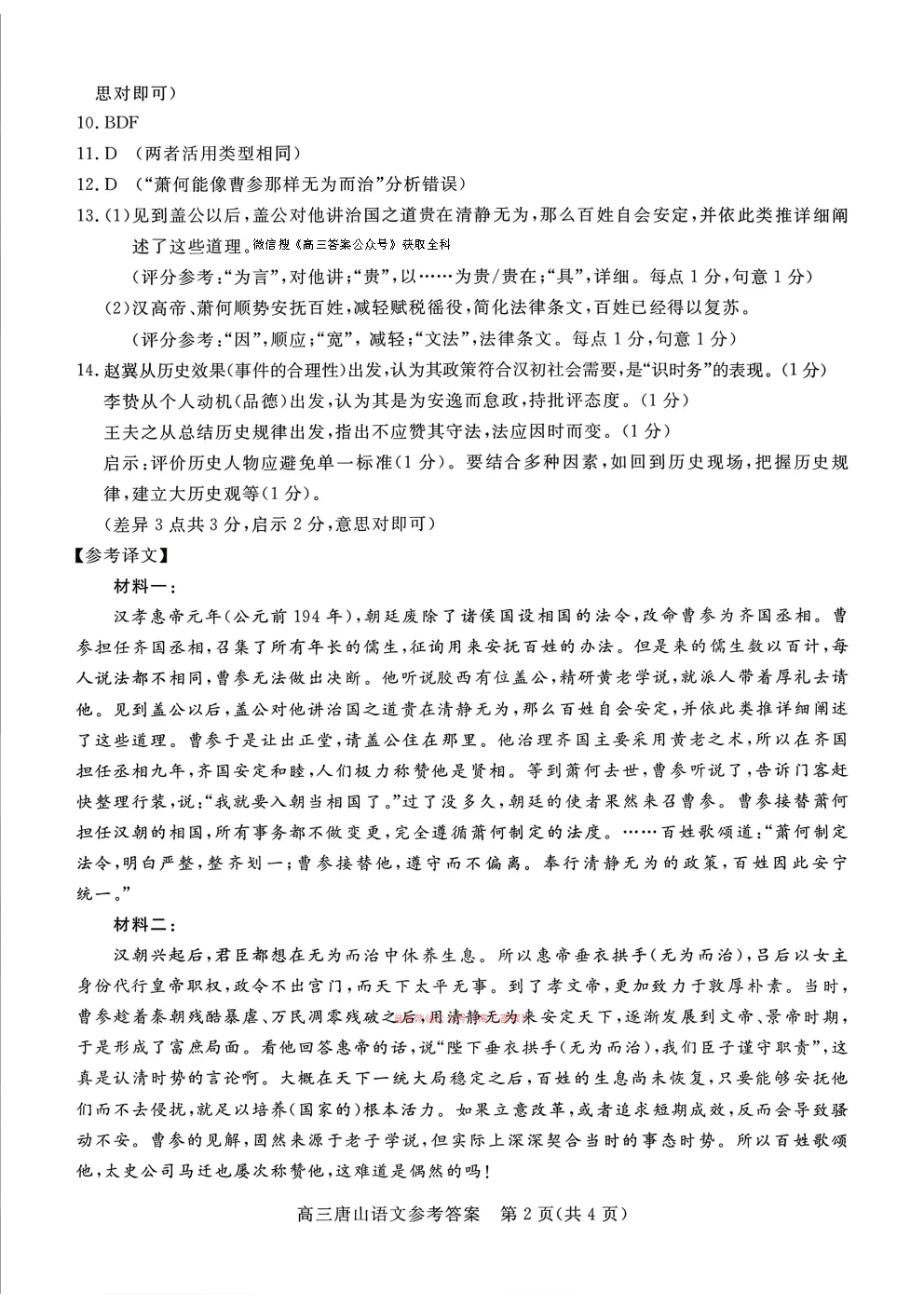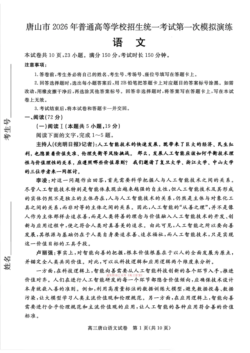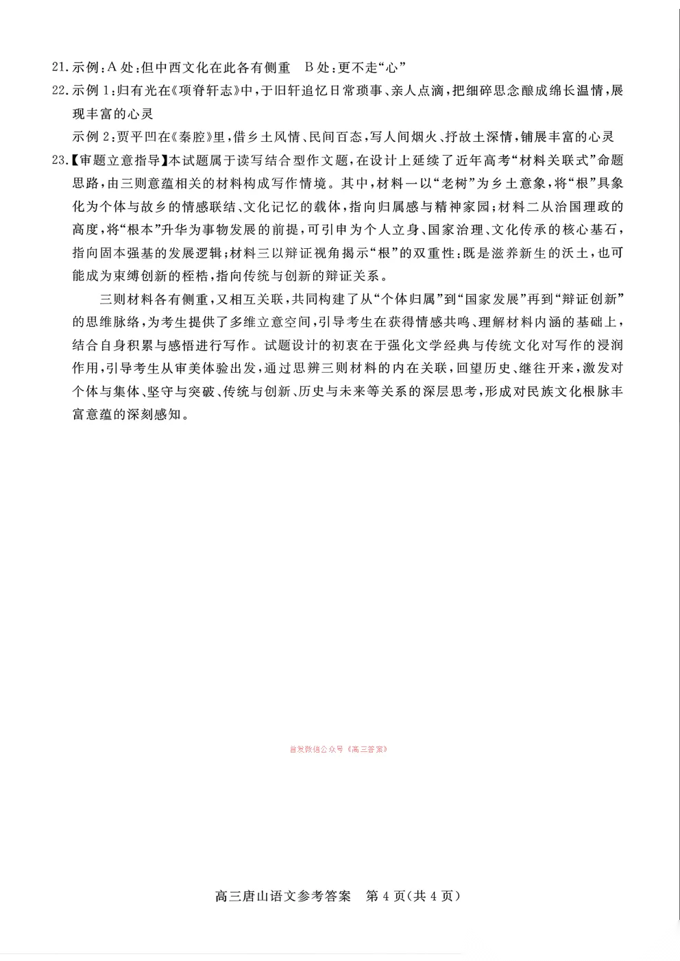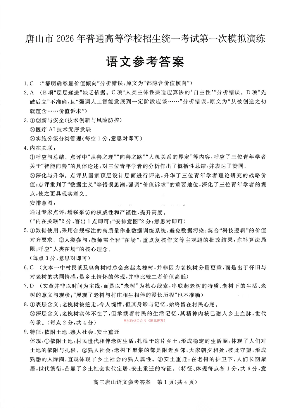 【唐山一模】唐山市2026年高三第一次模拟演练答案