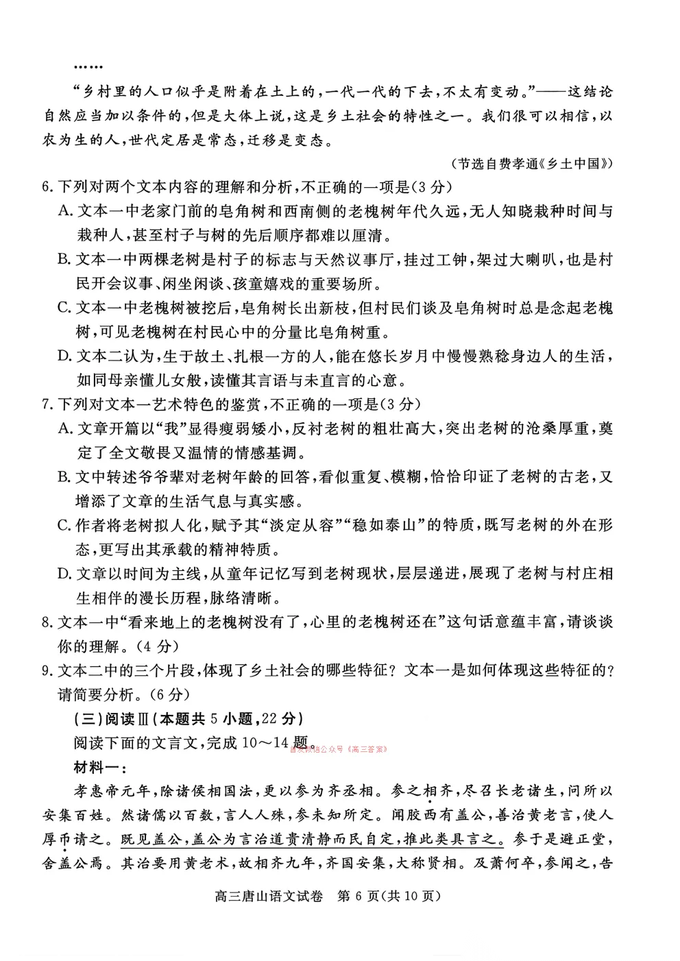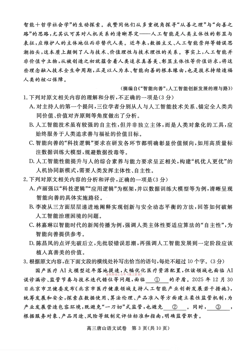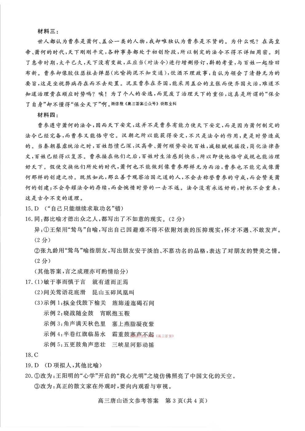 【唐山一模】唐山市2026年高三第一次模拟演练答案