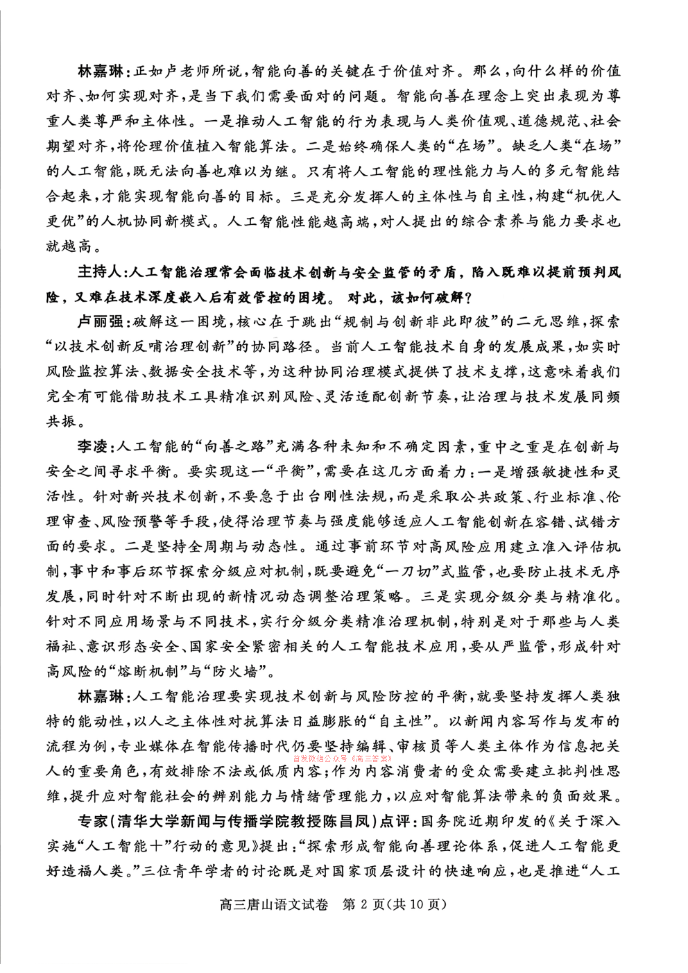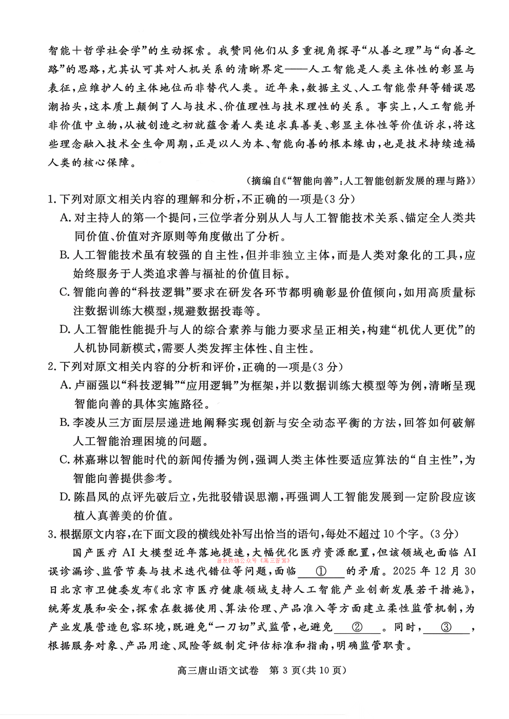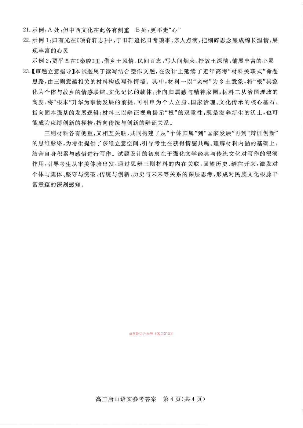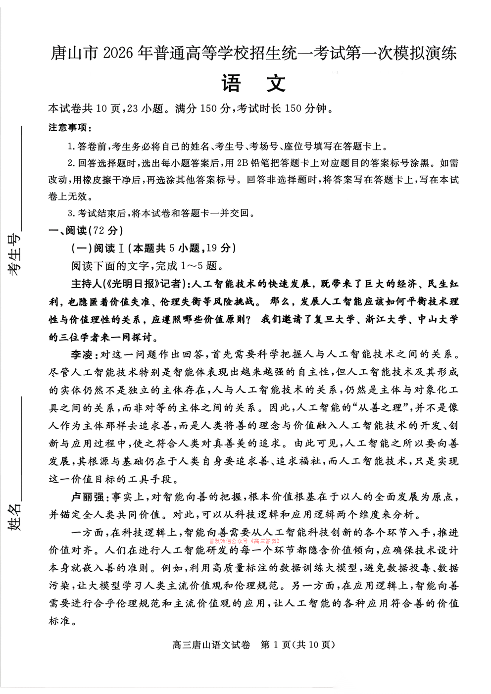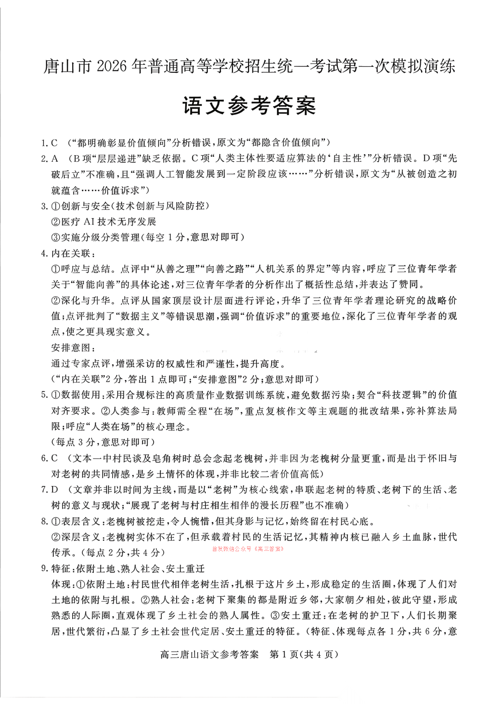 【唐山一模】唐山市2026年高三第一次模拟演练答案 【唐山一模】唐山市2026年高三第一次模拟演练答案