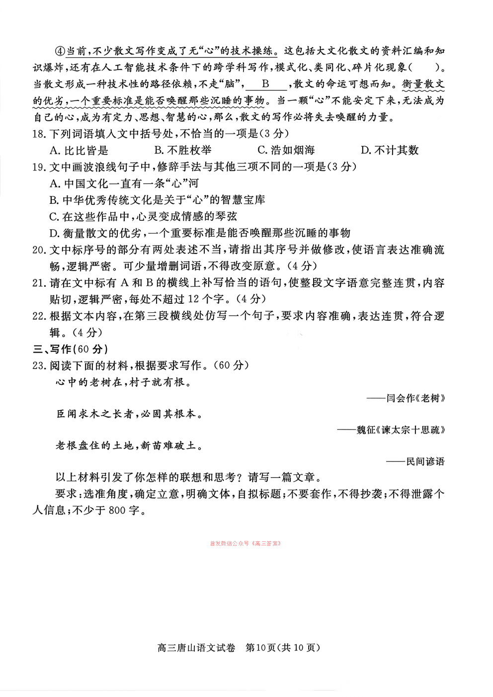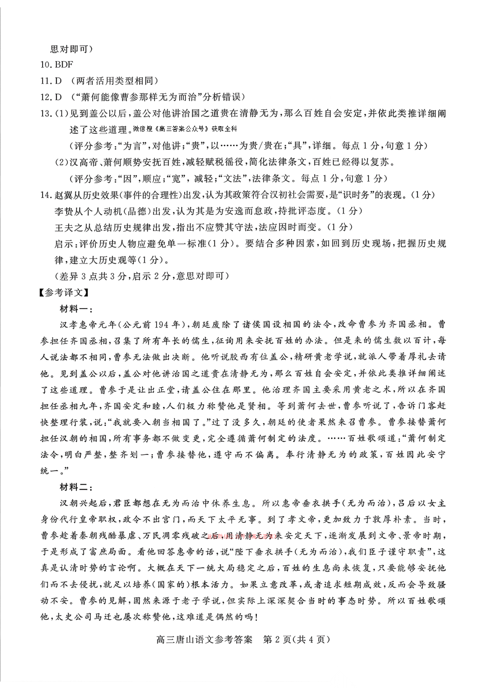 【唐山一模】唐山市2026年高三第一次模拟演练答案