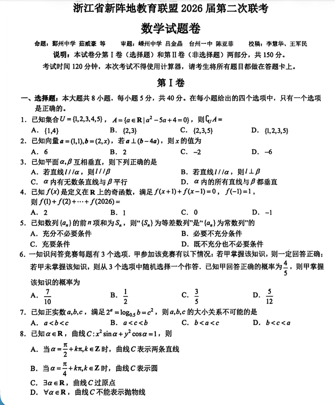 浙江新阵地教育联盟2026届高三下学期3月开学考试