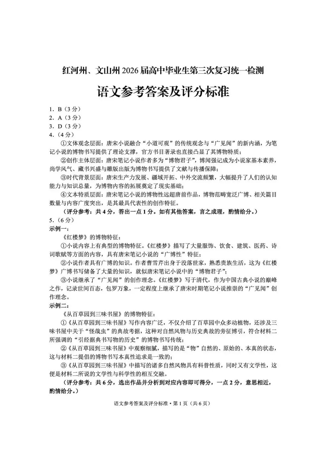 红河州、文山州2026届高中毕业生第三次复习统一检测答案(三统) 红河州、文山州2026届高中毕业生第三次复习统一检测答案(三统)