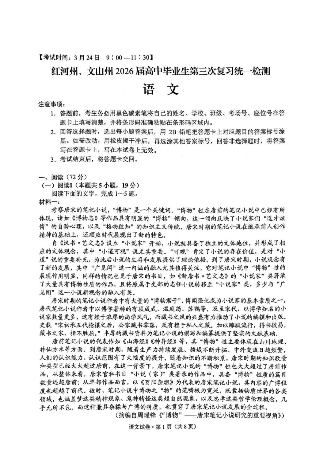 云南红河州、文山州2026届高中毕业生高三下学期语文第三次复习统一检测语文