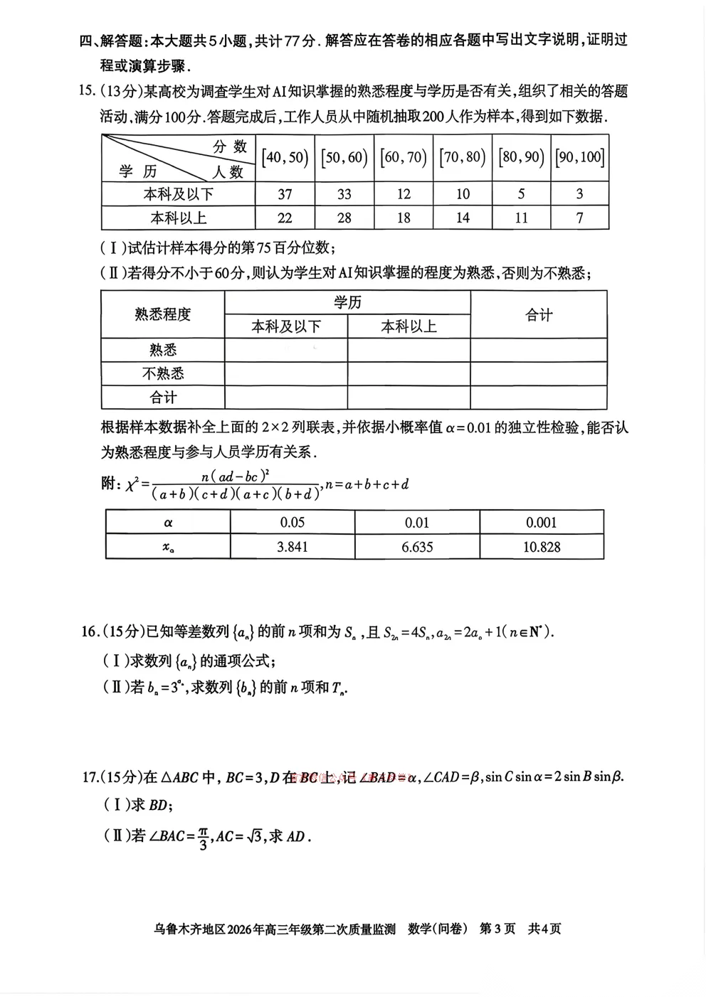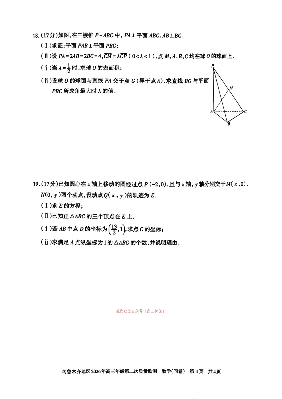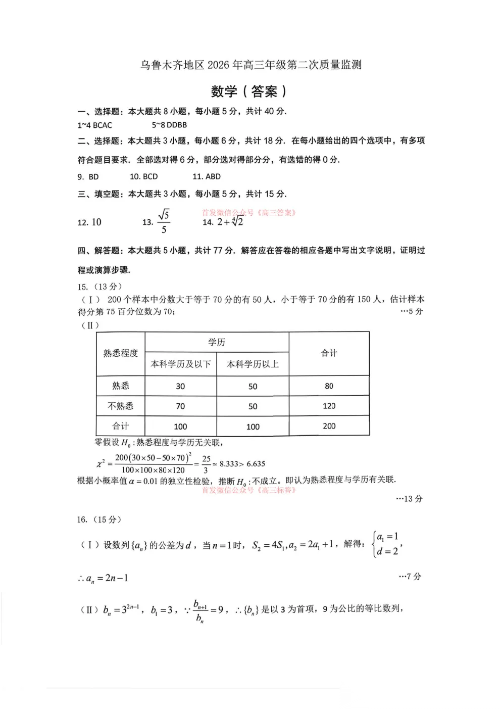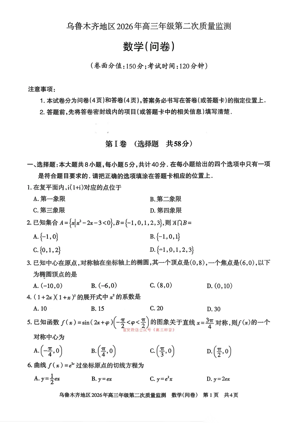 乌鲁木齐二模2026年高三年级第二次质量监测全科下载