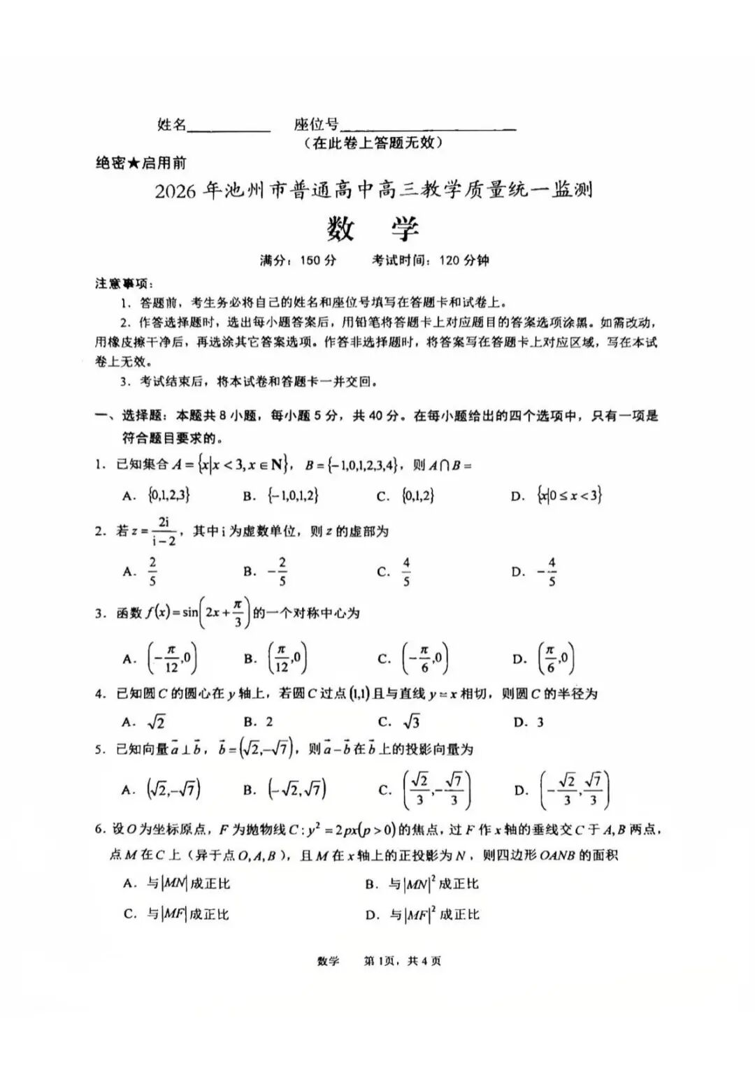 【池州一模】2026届安徽池州高三教学质量统一监测试卷及答案汇总