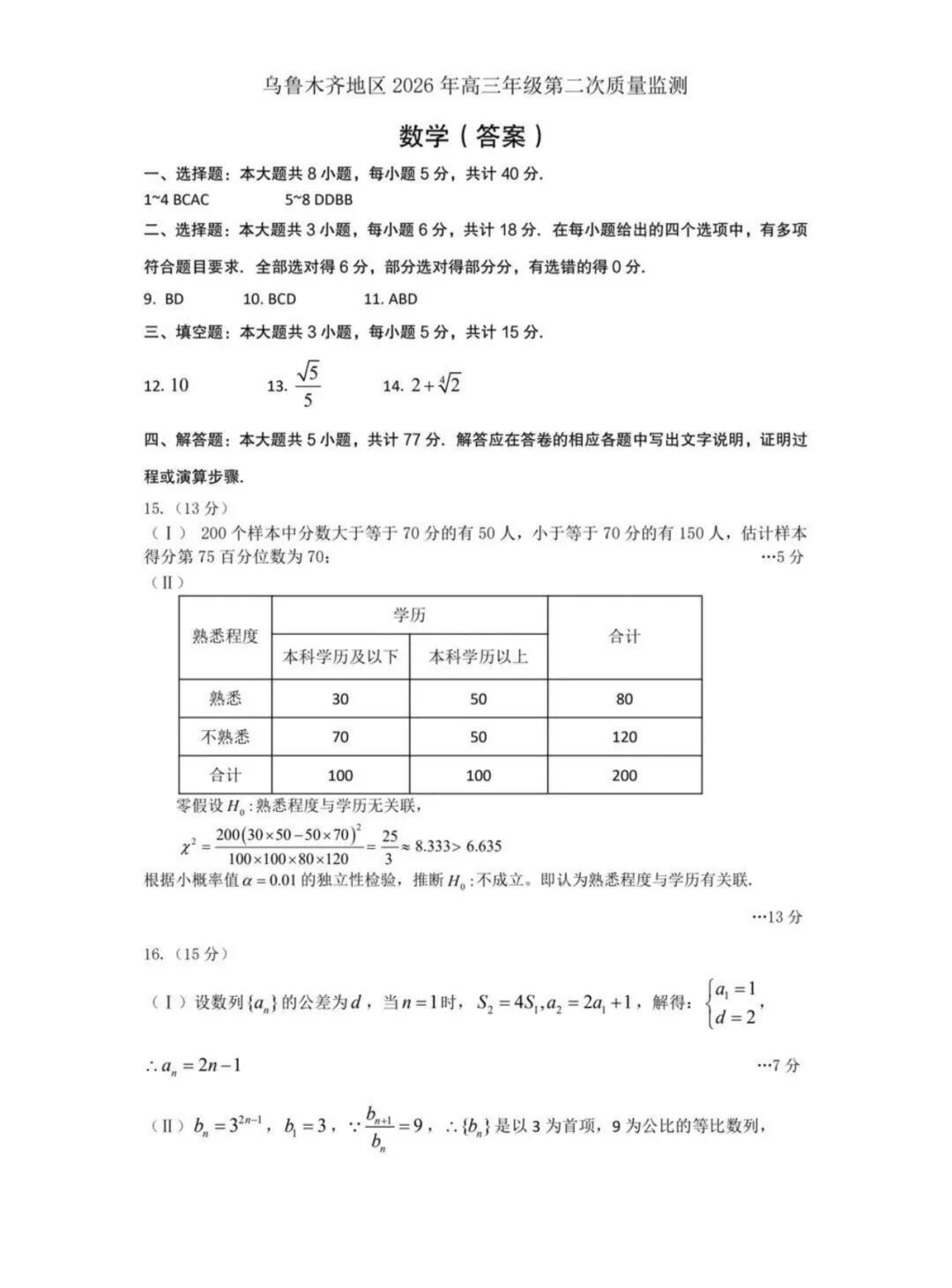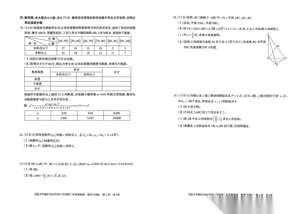 【全科】新疆乌鲁木齐地区2026年高三年级第二次质量监测