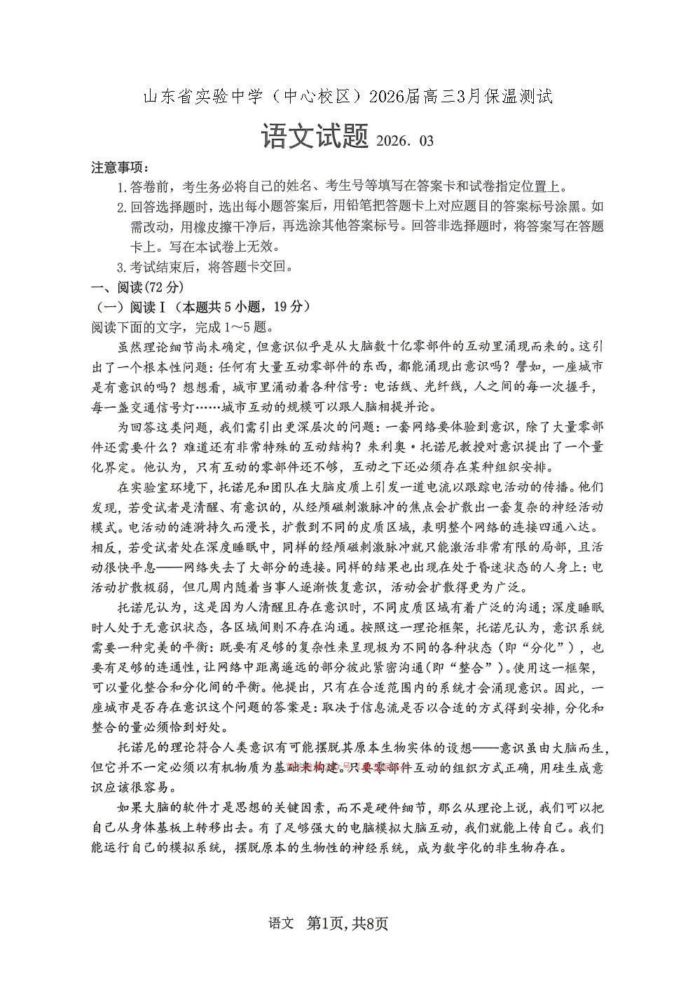 山东省实验中学2026届高三3月保温测试