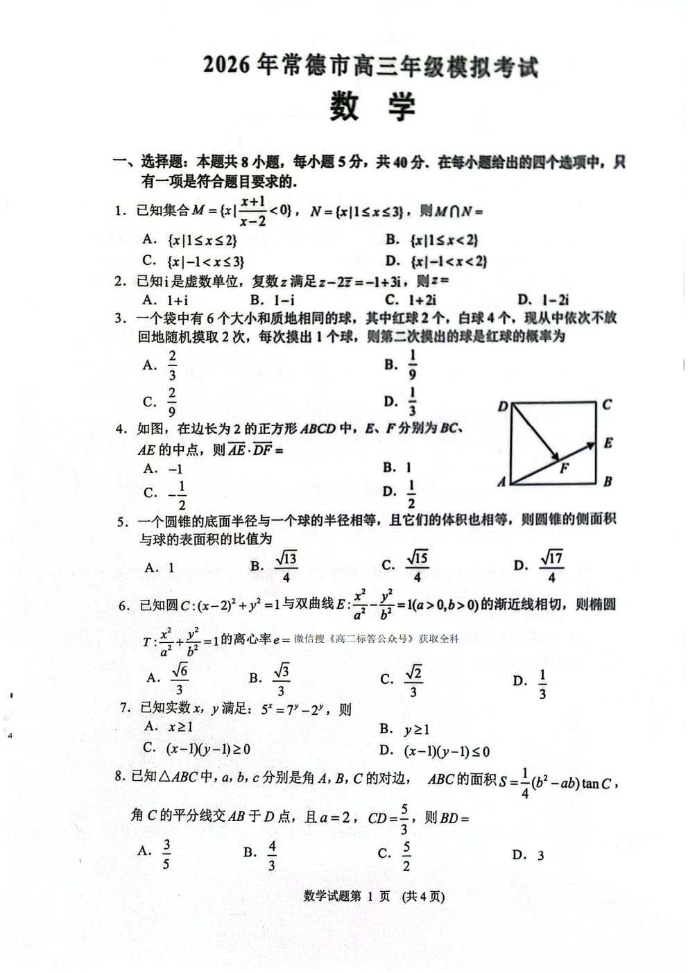 2026届娄底市高三3月联考答案 2026届娄底市高三3月联考答案