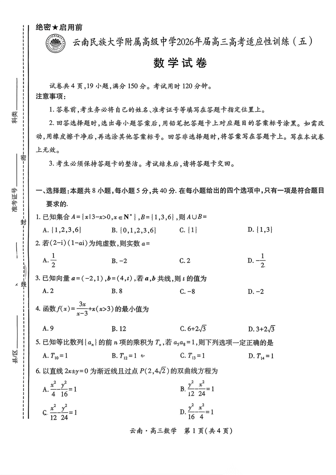 云南民族大学附属高级中学2026届高三高考适应性训练(五)