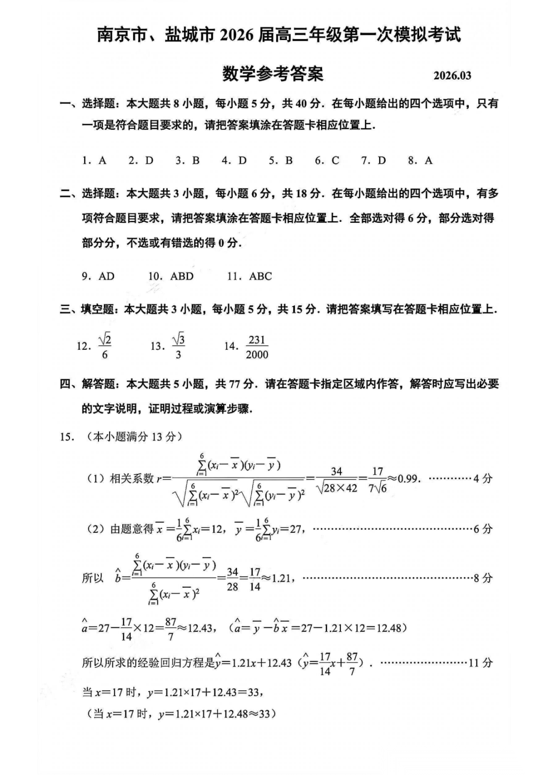 【全科】南京市、盐城市2026届高三年级下学期第一次模拟考试