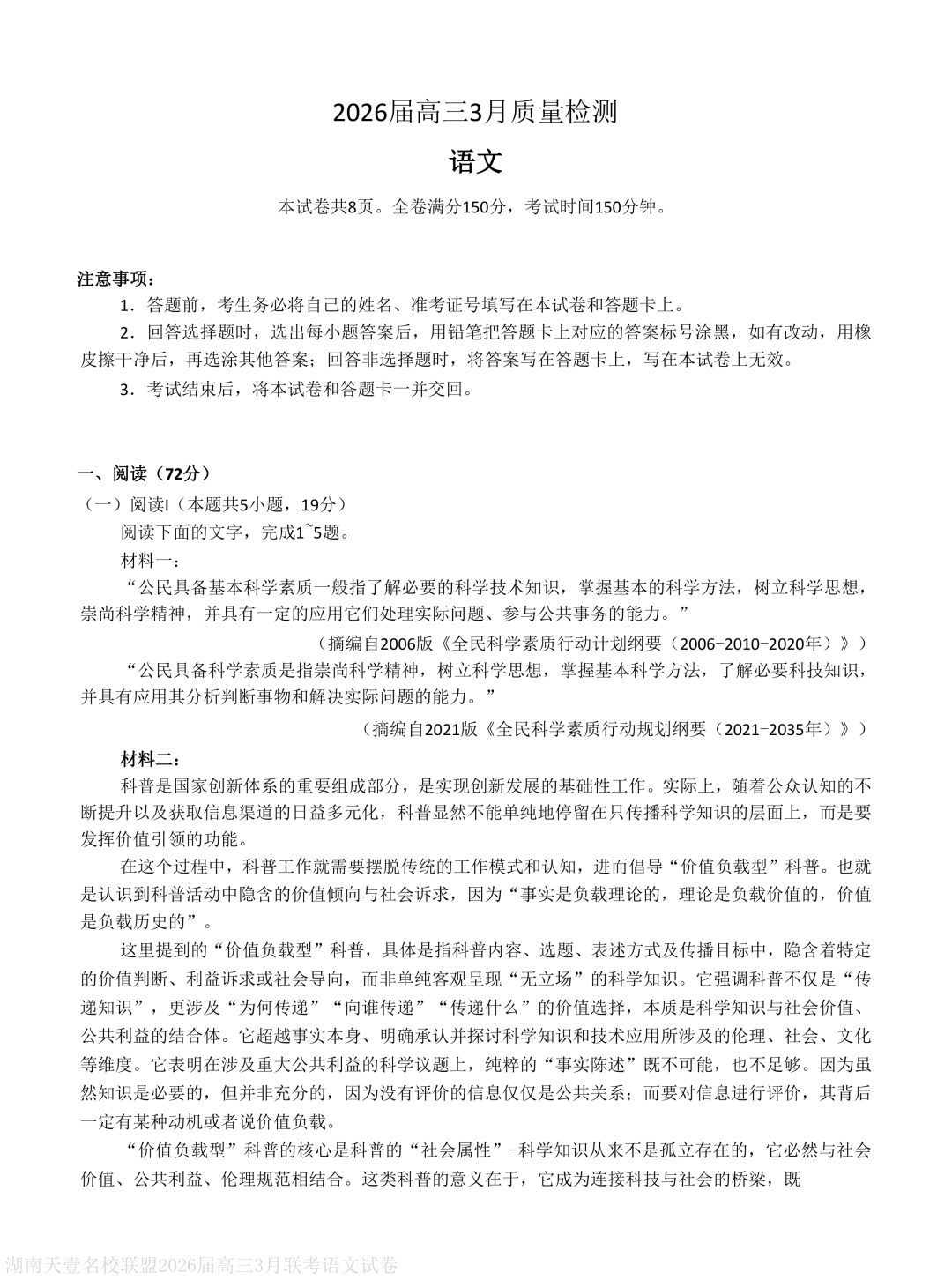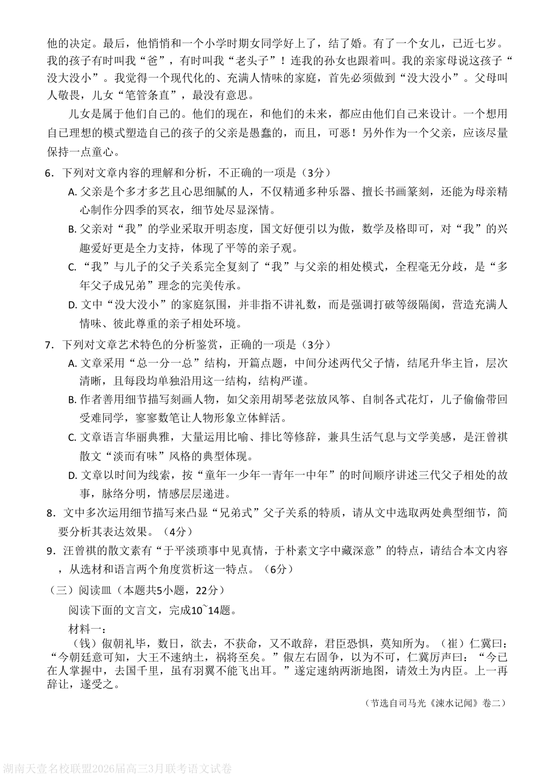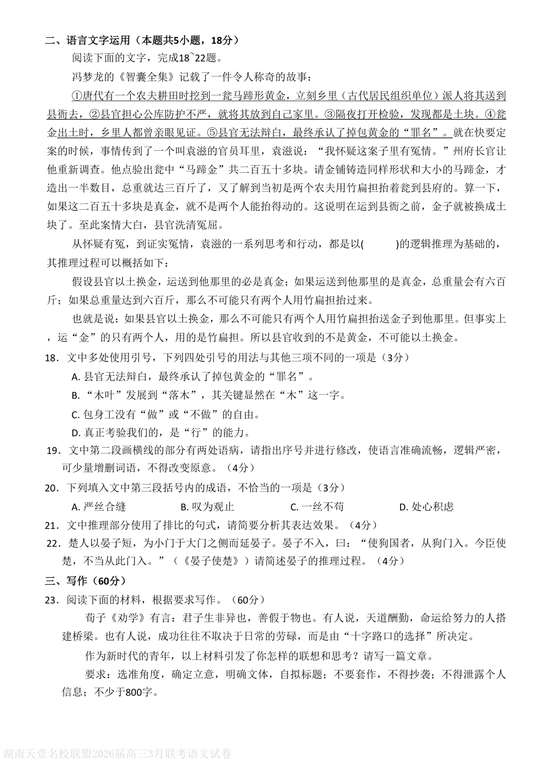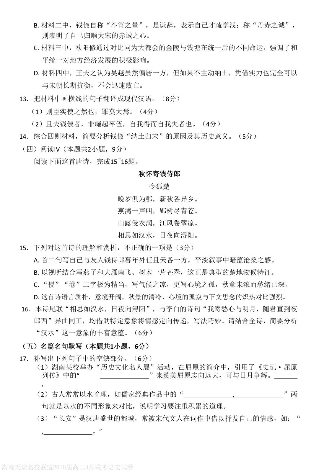 湖南省天壹名校联盟2026届高三下学期3月质量检测语文