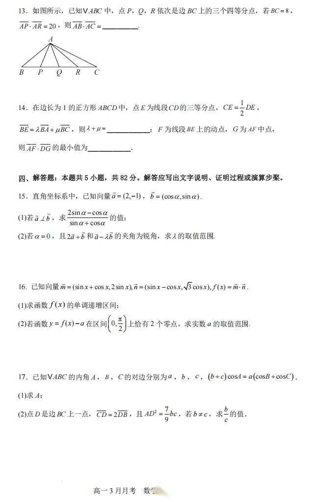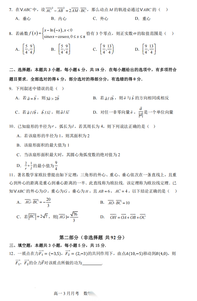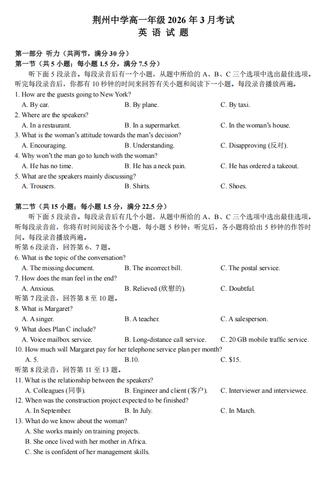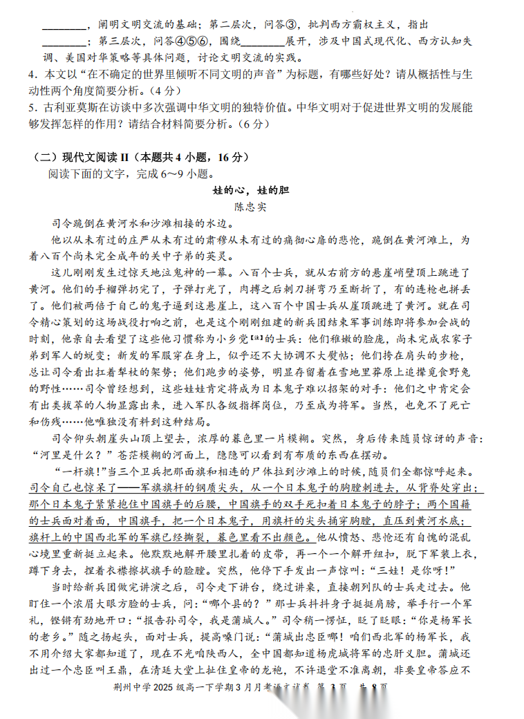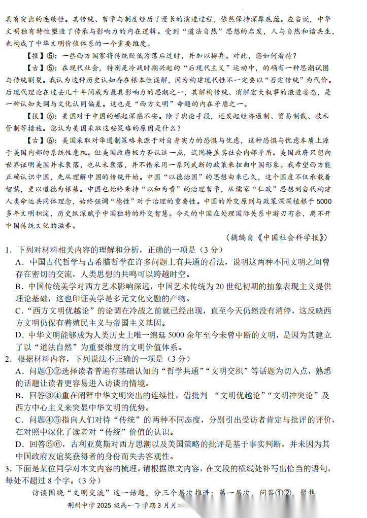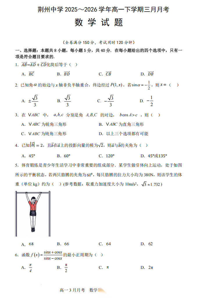 【湖北卷】【高一】湖北省荆州市荆州中学2025级(2028届)高一下学期3月月考(3.24-3.25) 全科试题卷+答案