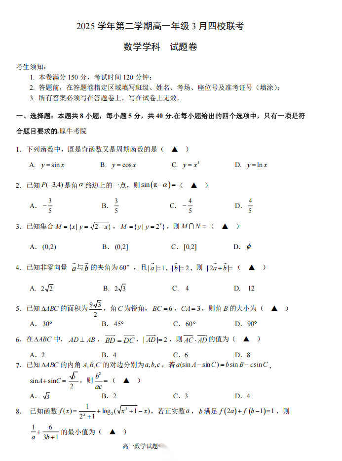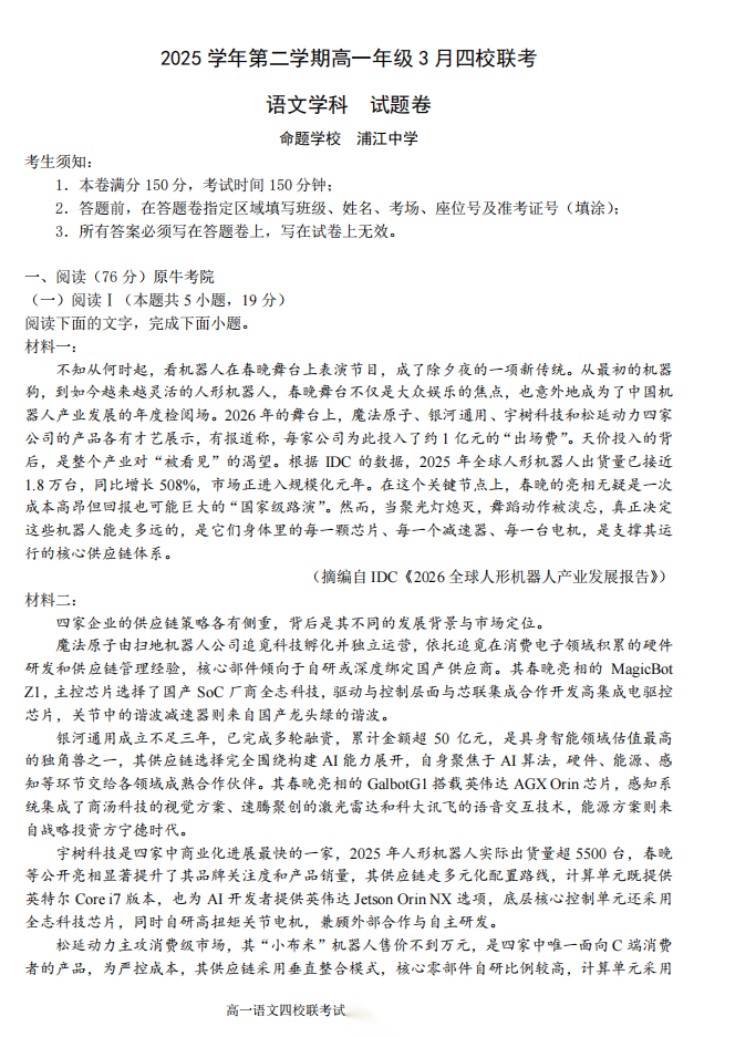 【浙江卷】【高一】浙江四校(含精诚联盟)2025-2026学年高一下学期3月阶段检测(3.26-3.27) 全科试题卷+答案