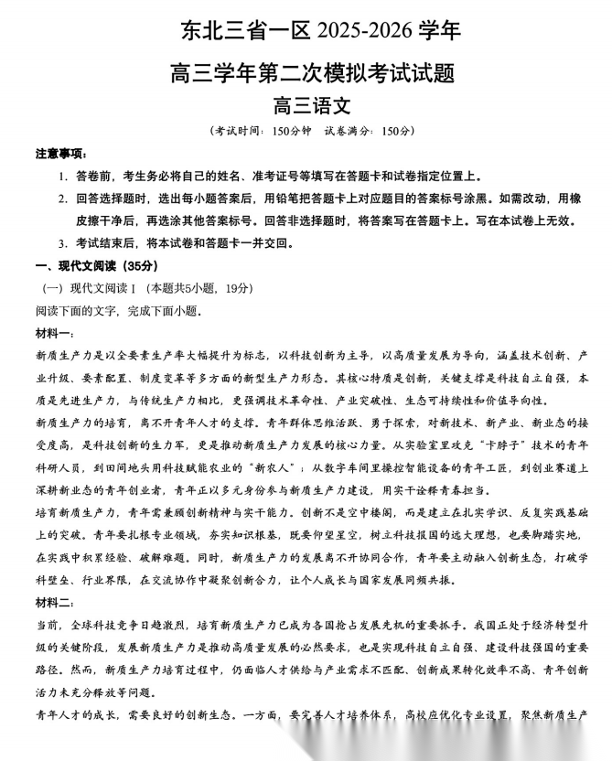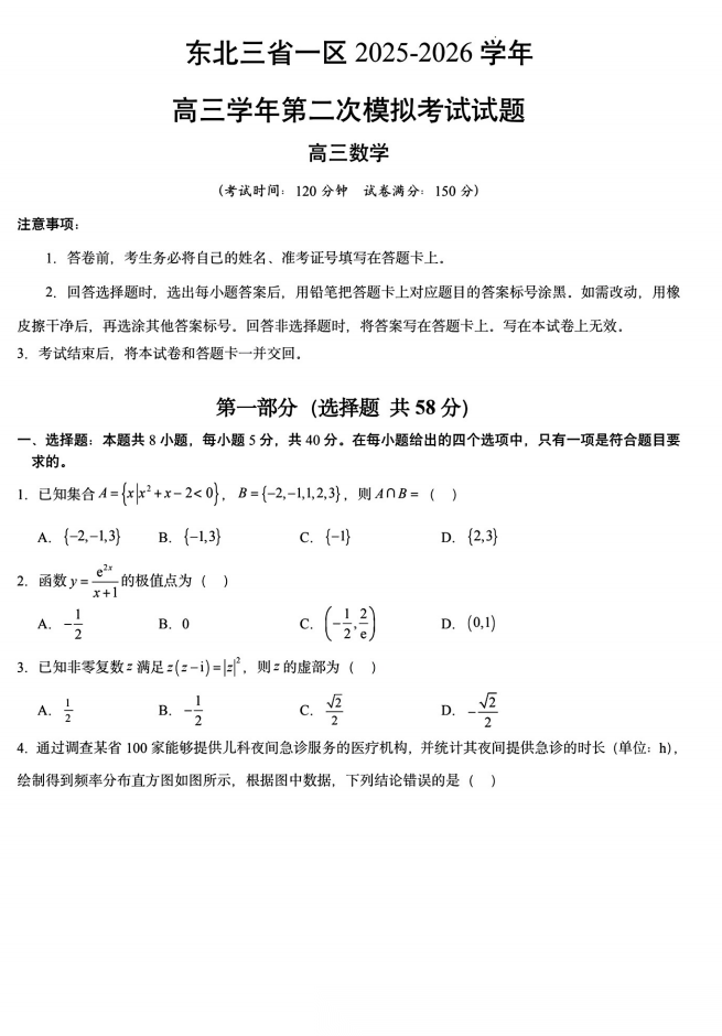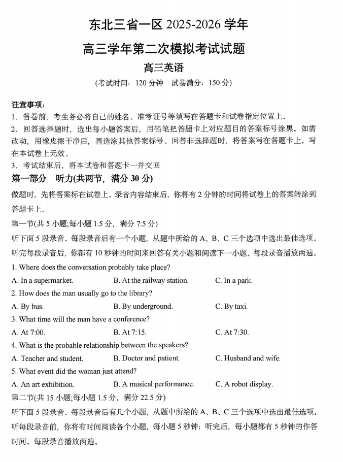 【黑吉辽蒙卷】东北三省一区2025-2026学年高三学年第二次模拟考试(一区二模)(3.19-3.20) 全科试题卷+答案
