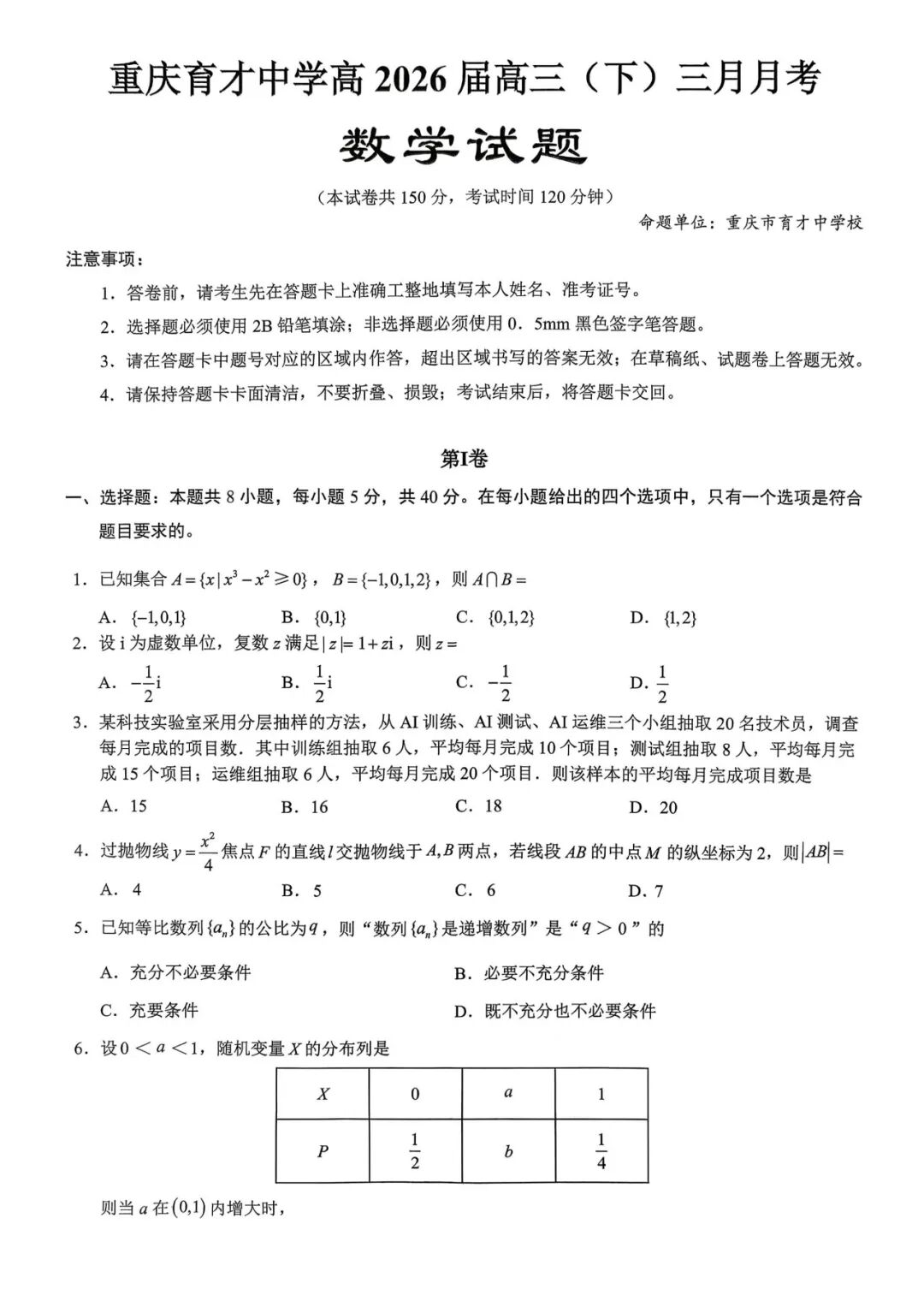 【全科】重庆育才中学高2026届高三(下)3月月考