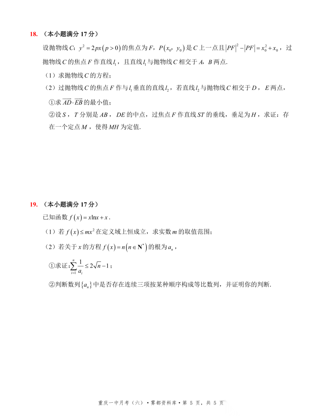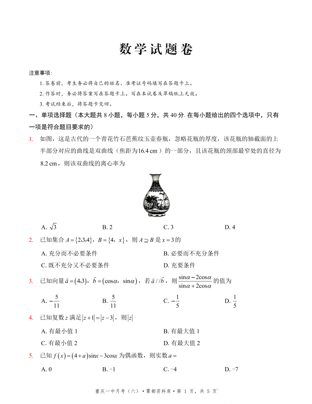 【全科】重庆市第一中学2026届3月高考适应性月考卷(六)