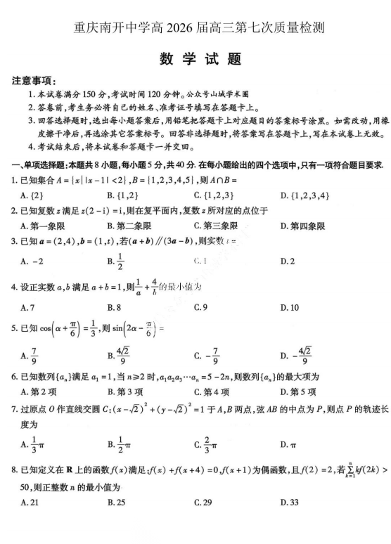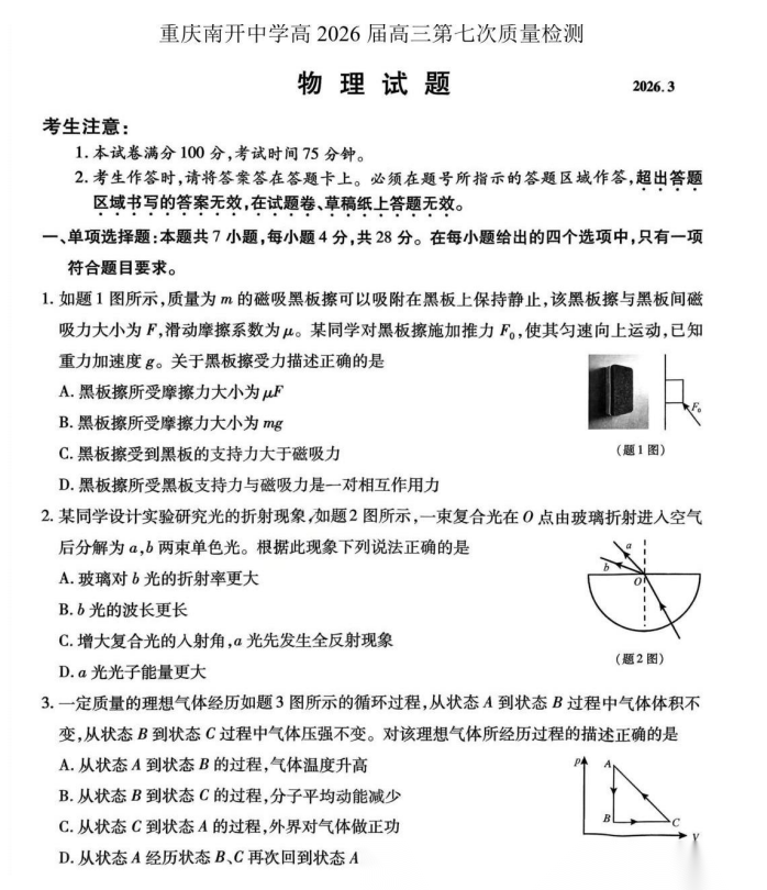 【Top50强校】【重庆卷】重庆市南开中学高2026届高三年级第七次质量检测(3.30-3.31) 数学物理语文历史试题卷+答案