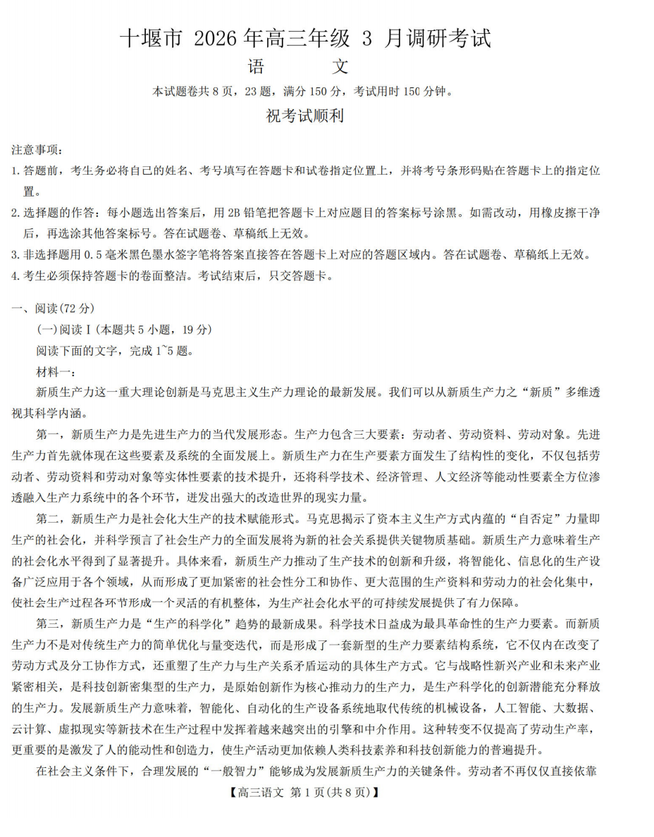 【湖北卷】湖北省十堰市2026年高三年级3月调研考试(3.30-3.31) 数学语文试题卷+答案