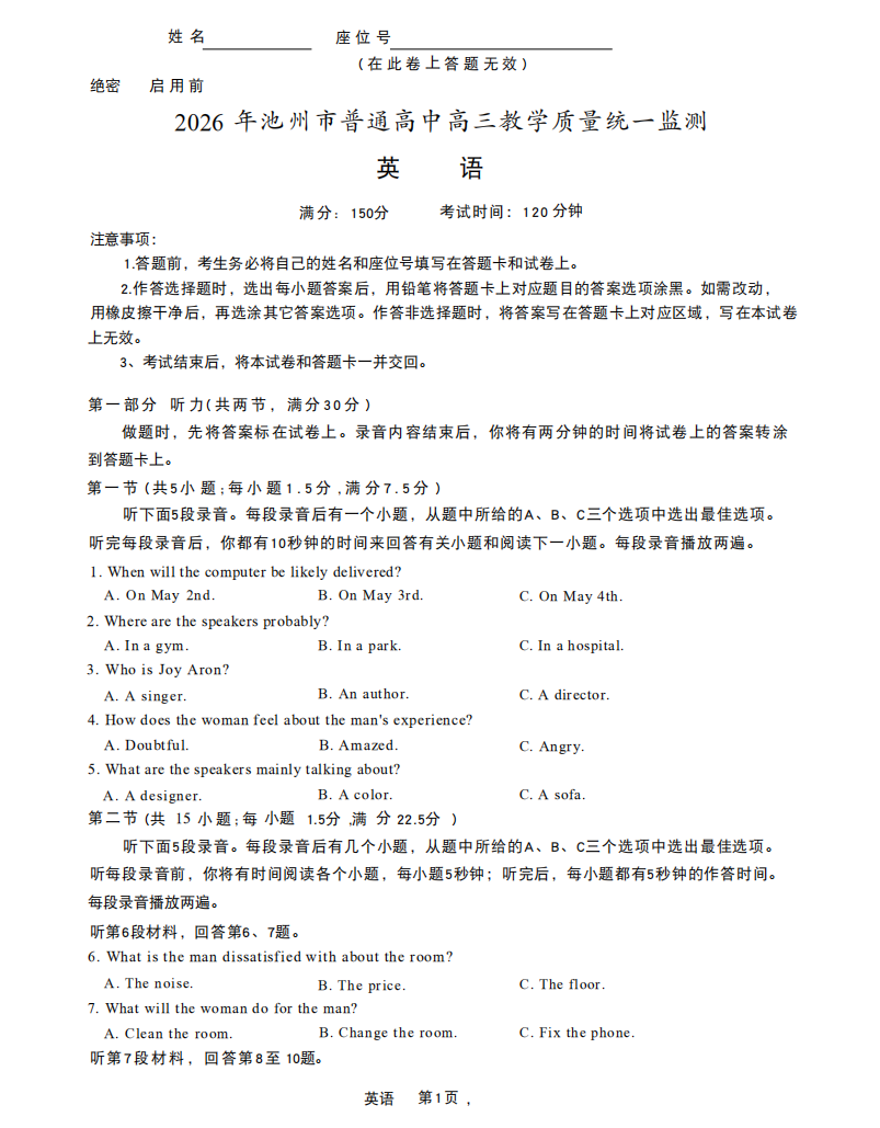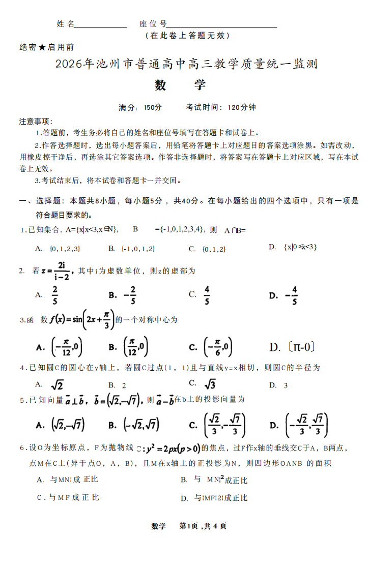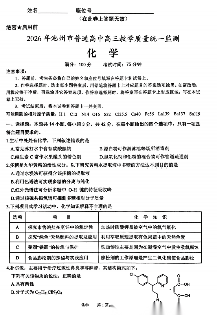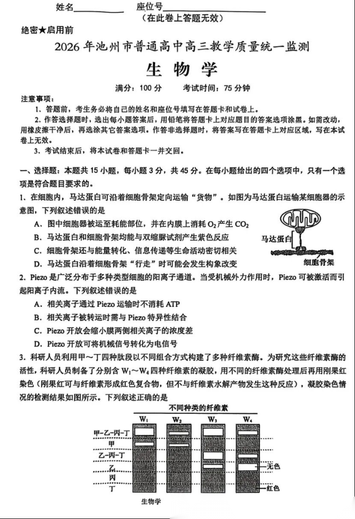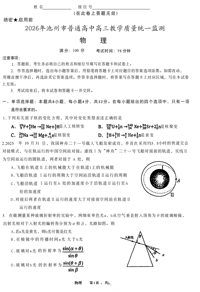 【安徽卷】安徽省池州市2026年普通高中高三教学质量统一监测(池州一模)(3.26-3.28) 理科全科试题卷+答案