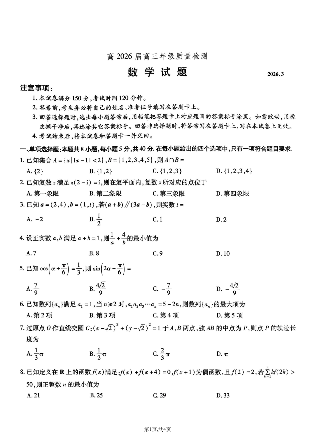 宁夏银川市、石嘴山市、吴忠市三市2026届高三下学期3月学科教学质量检测 宁夏银川市、石嘴山市、吴忠市三市2026届高三下学期3月学科教学质量检测
