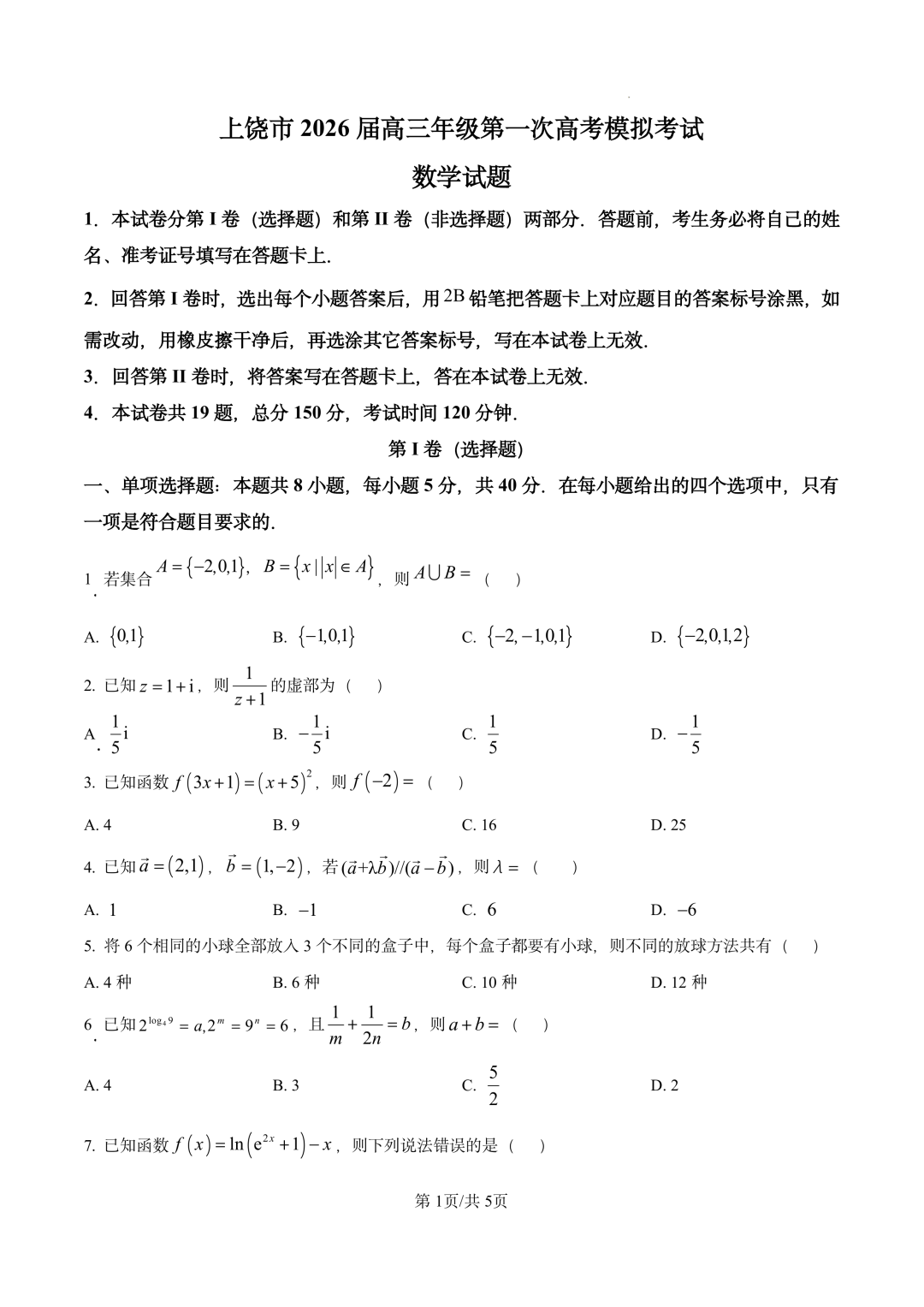 江西省上饶市2026届高三年级第一次高考模拟考试(上饶一模)