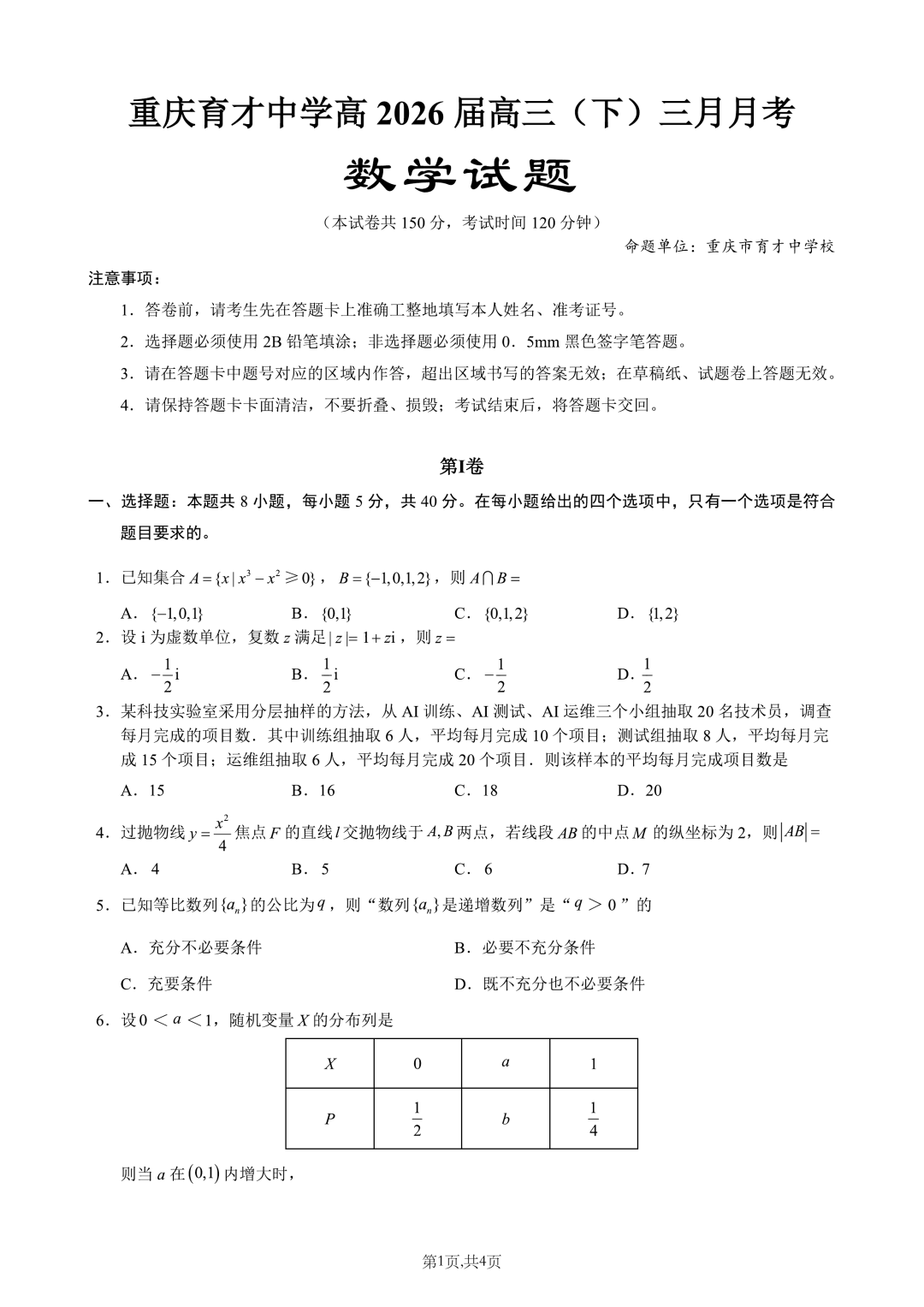 重庆市育才中学高2026届高三(下)3月月考