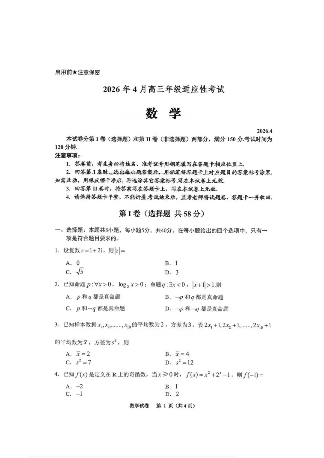【语、数】2026年贵州省4月高三年级适应性考试 【语、数】2026年贵州省4月高三年级适应性考试