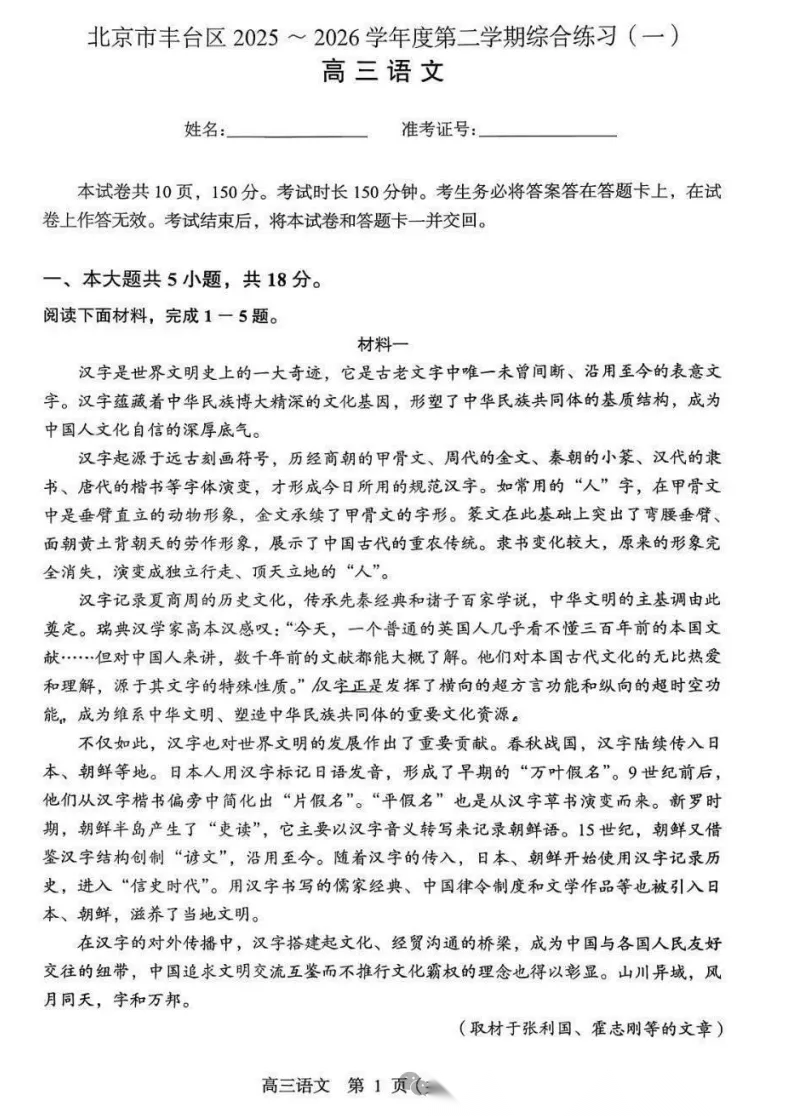【北京卷】北京市丰台区2025-2026学年度第二学期综合练习(一)(丰台一模)(3.30-4.2) 数学语文英语试题卷+答案