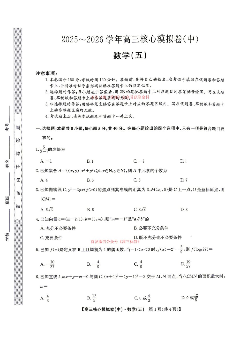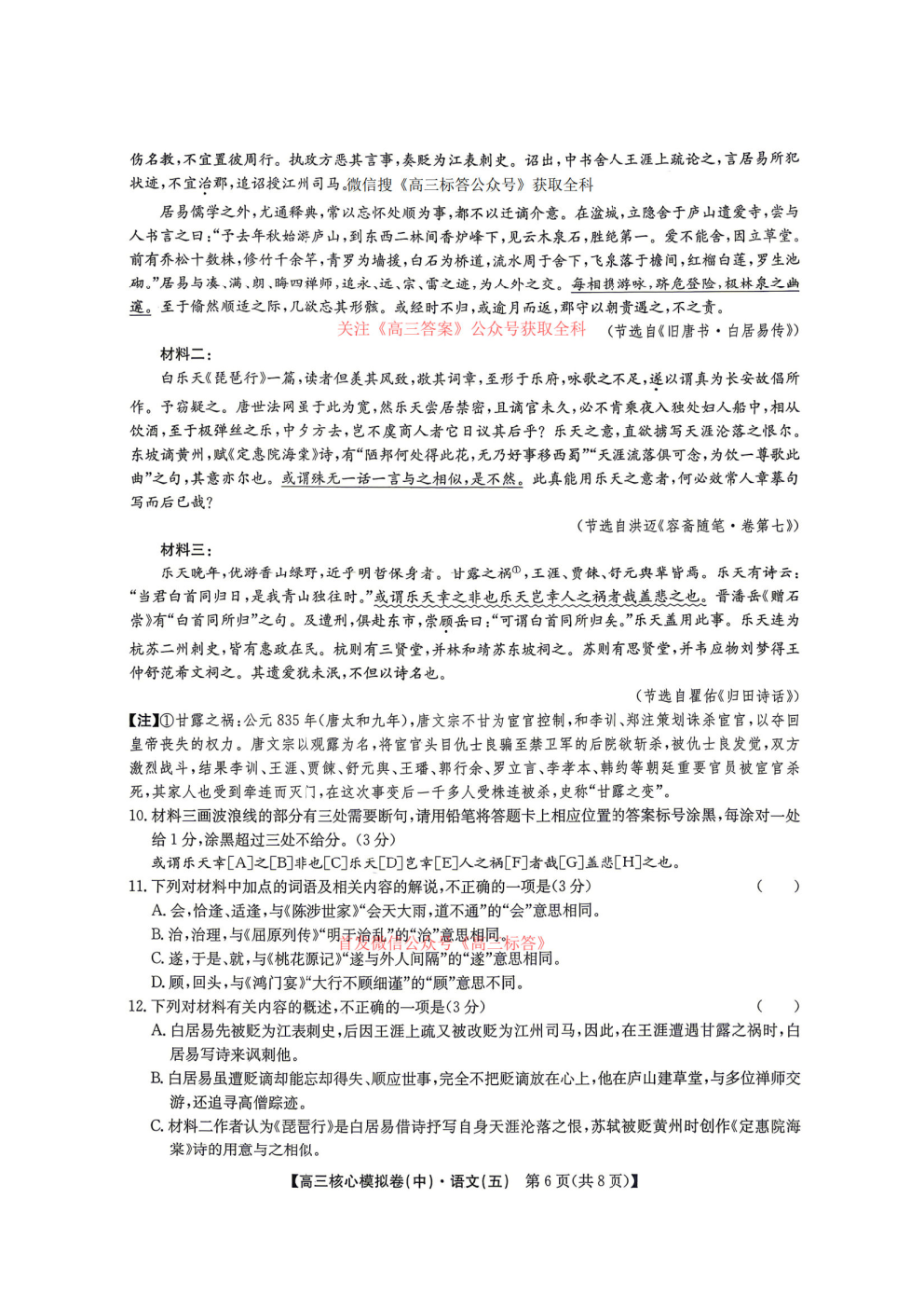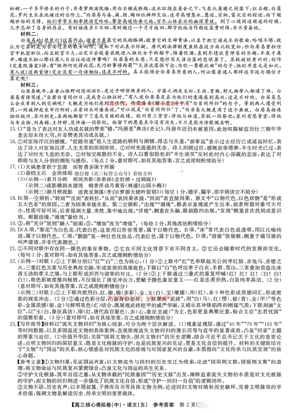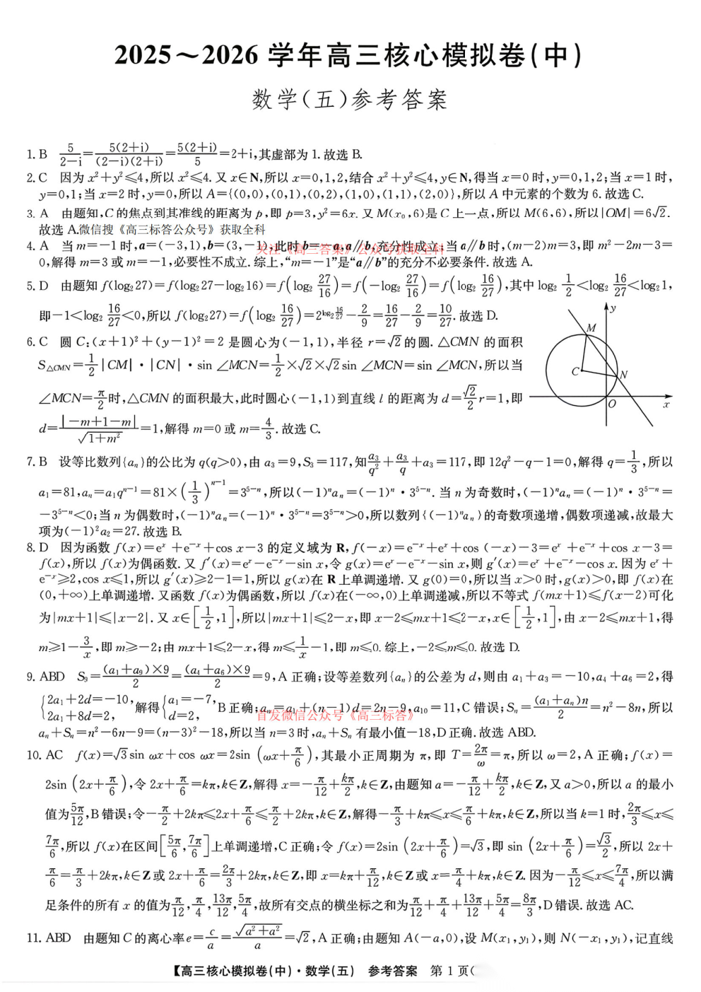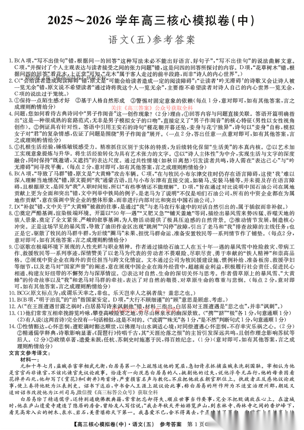 九师联盟2025-2026学年高三核心模拟卷中五答案