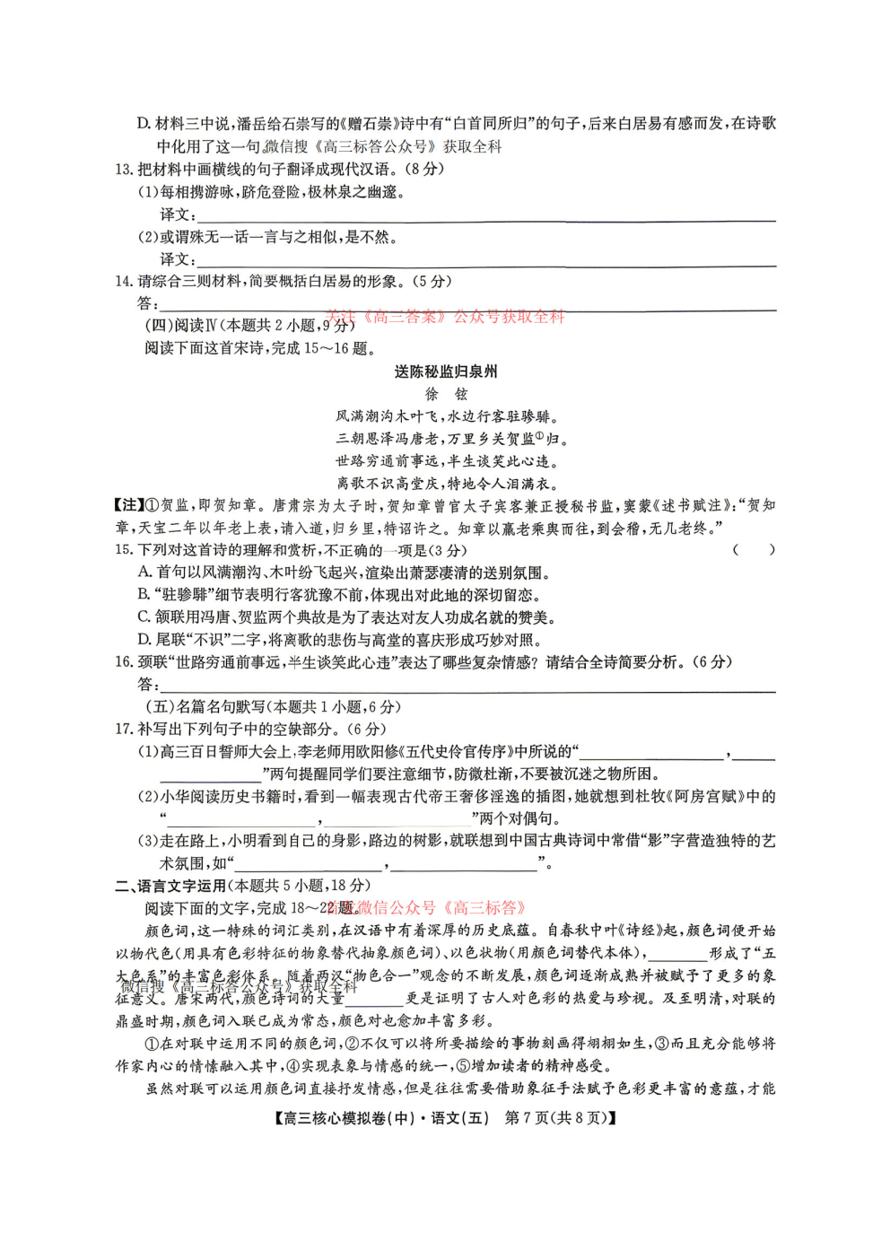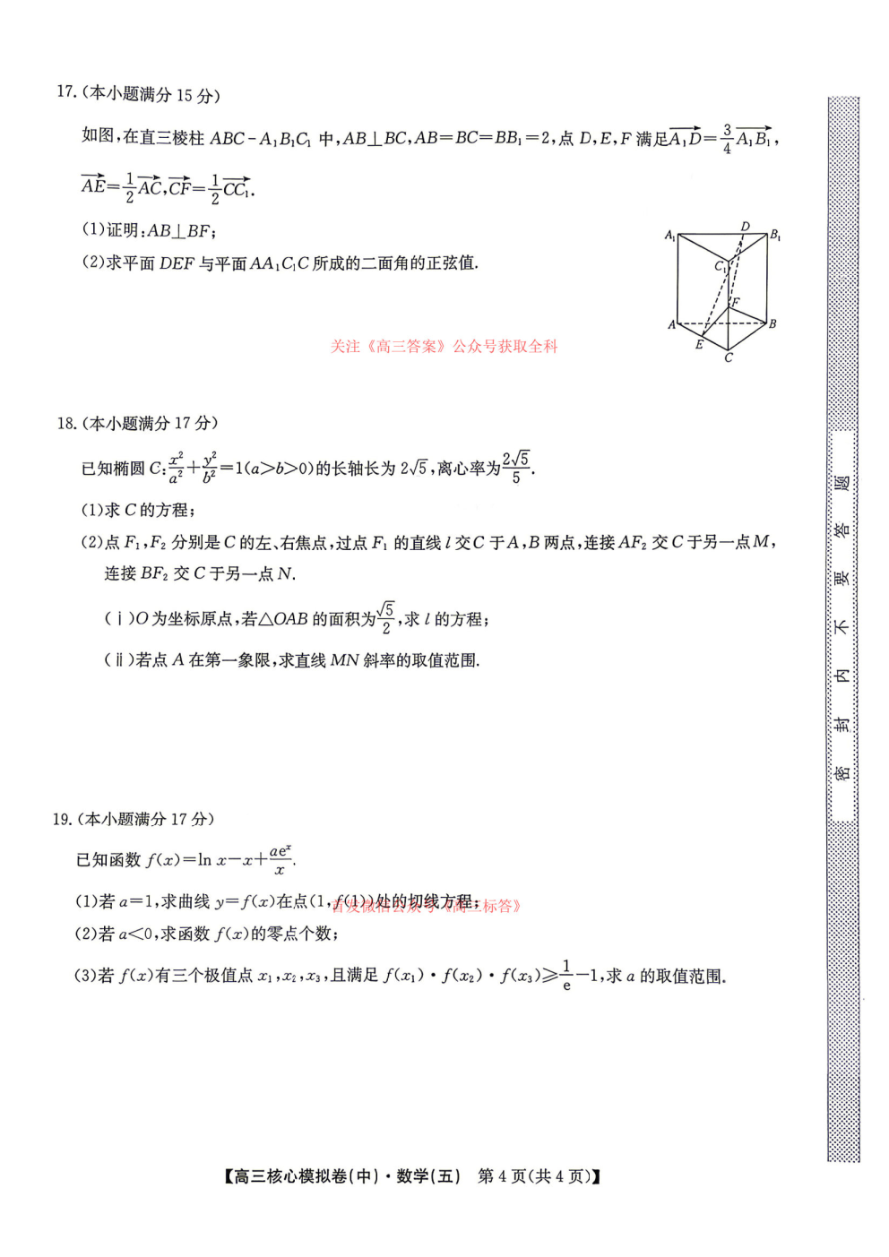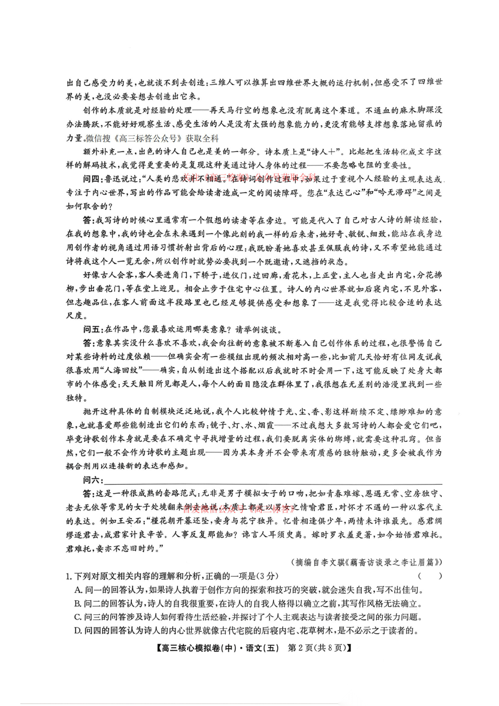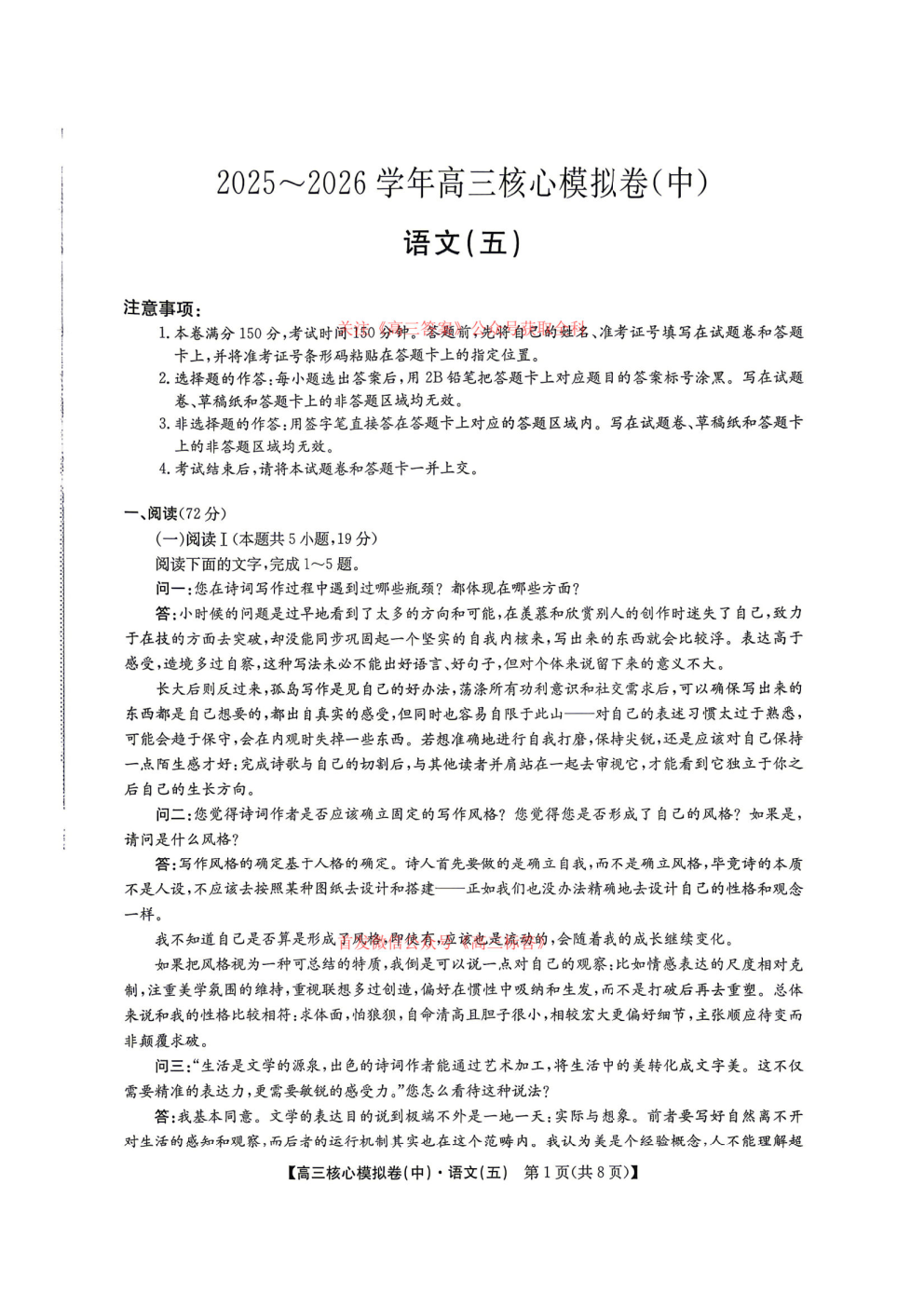 九师联盟2025-2026学年高三核心模拟卷中五答案