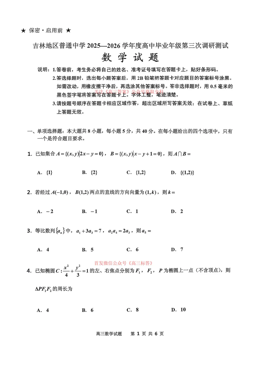 【吉林三调】吉林地区2025-2026学年度高三第三次调研测试全科试卷及答案
