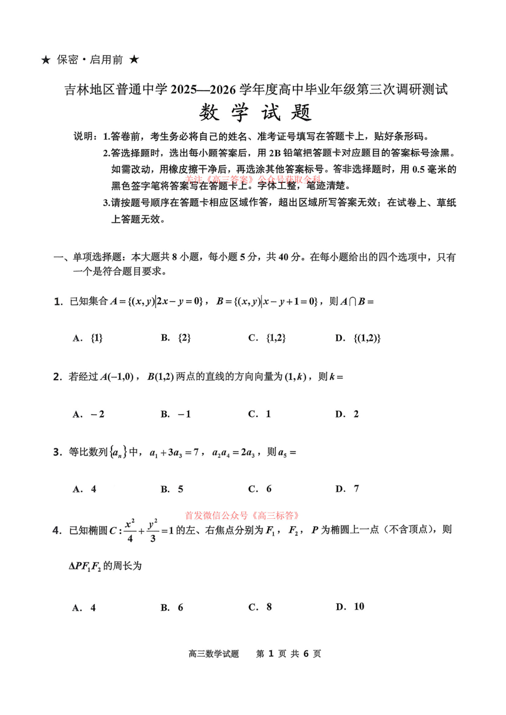 【吉林三调】吉林地区2025-2026学年度高三第三次调研测试全科试卷及答案 【吉林三调】吉林地区2025-2026学年度高三第三次调研测试全科试卷及答案