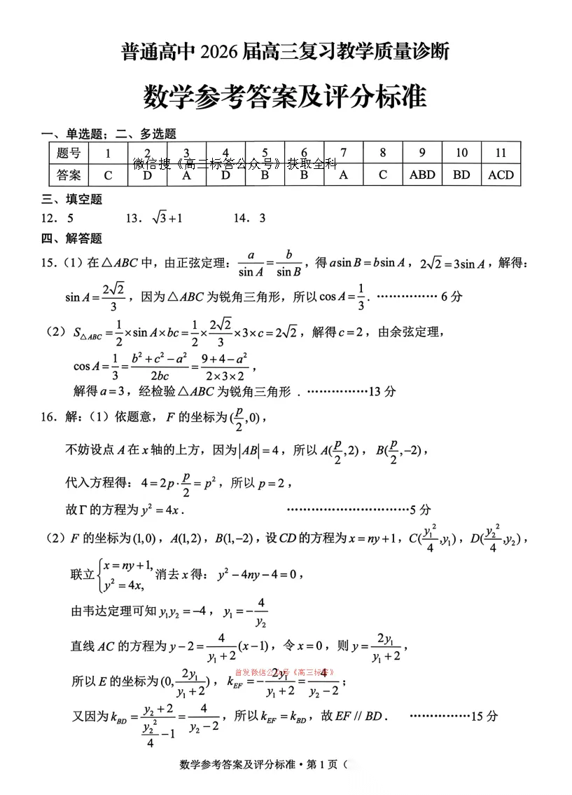 江西省八所重点中学2026届高三4月联考答案 江西省八所重点中学2026届高三4月联考答案