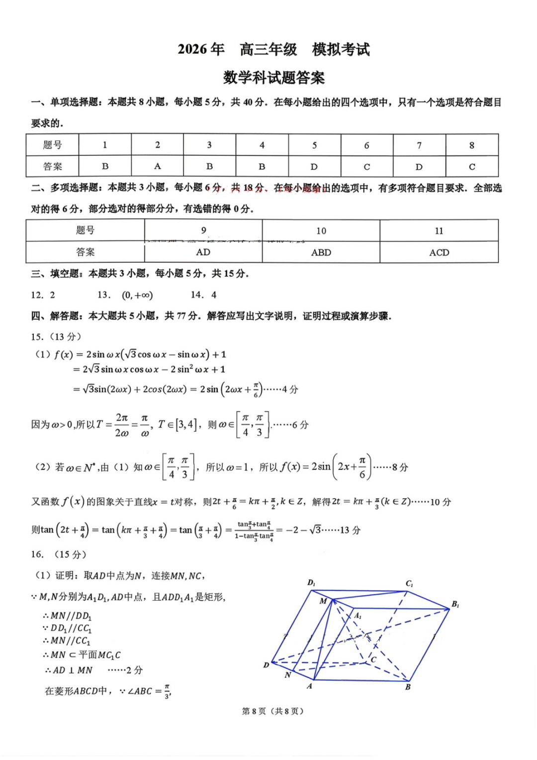 江西省八所重点中学2026届高三4月联考答案 江西省八所重点中学2026届高三4月联考答案