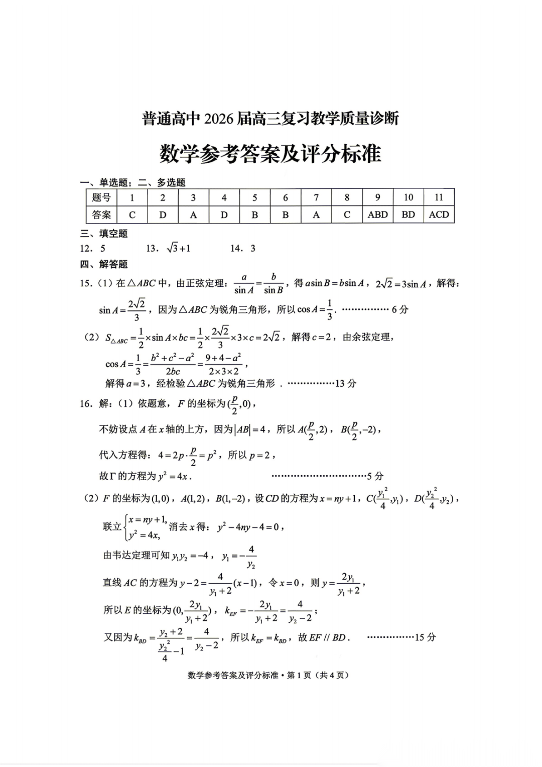 山东省2026年普通高中学业水平4月调研答案 山东省2026年普通高中学业水平4月调研答案