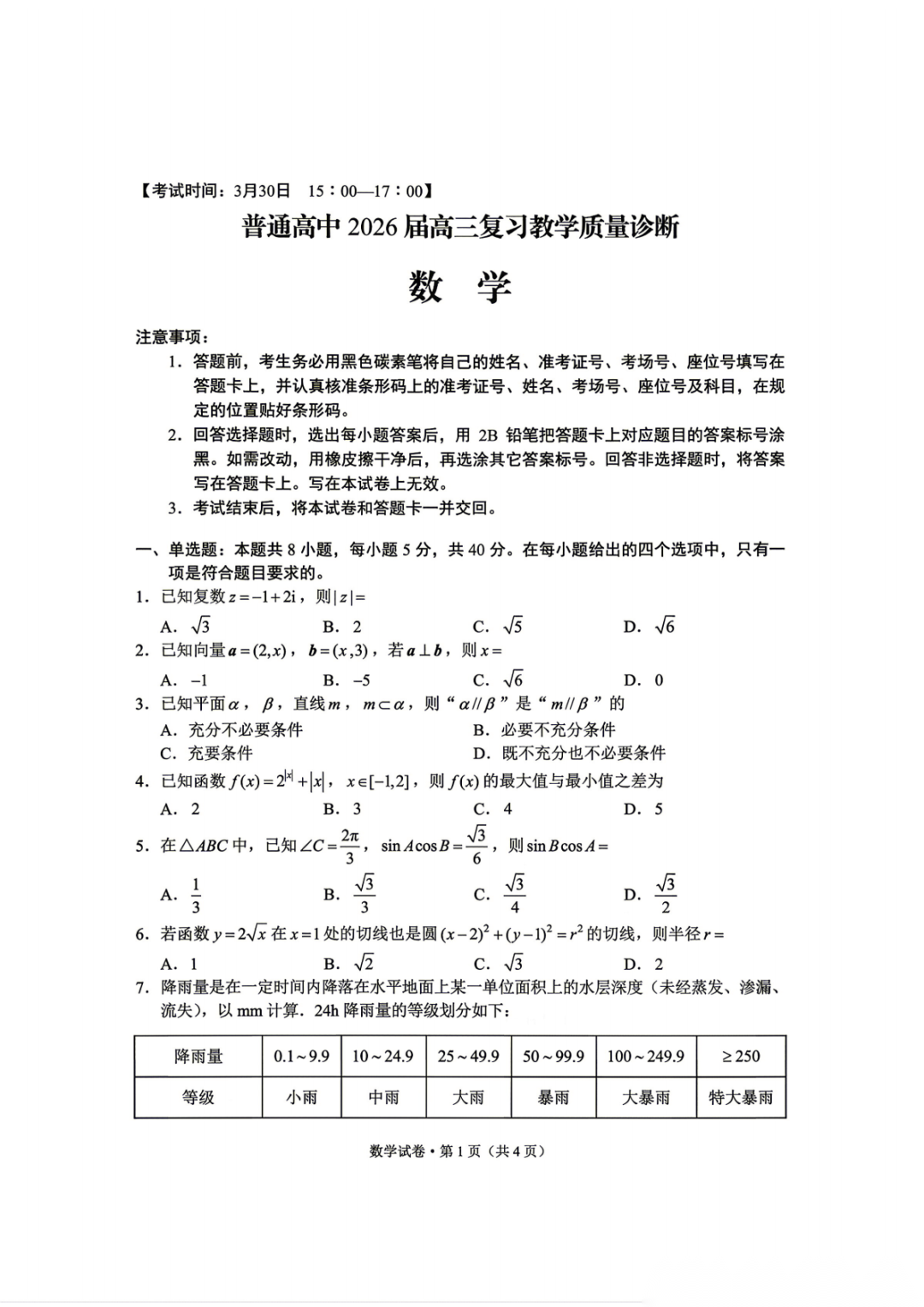 【昆明统测全科】云南省昆明市普通高中2026届高三复习质量教学质量诊断