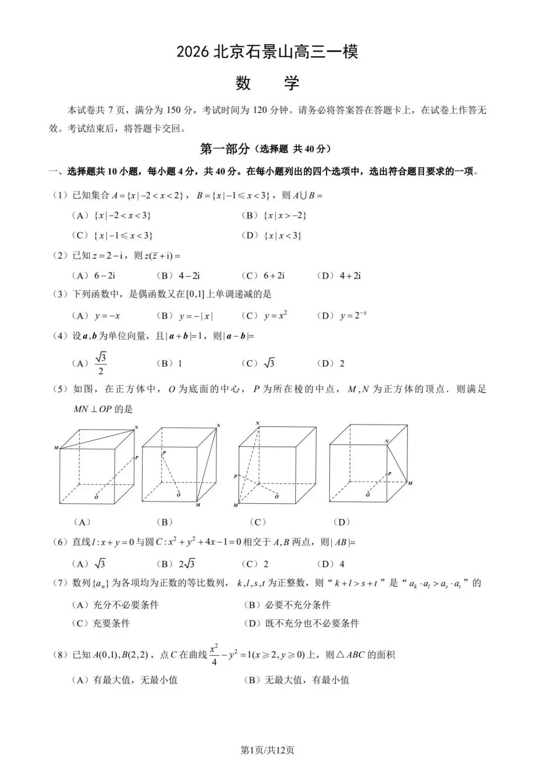 2026年北京石景山区高三一模统一练习试卷及答案汇总【石景山一模】