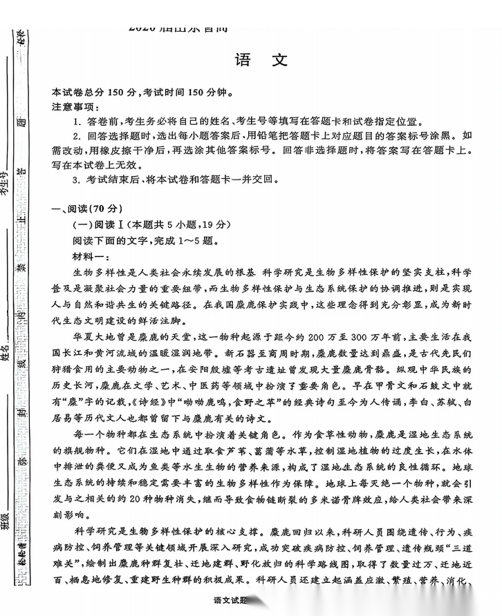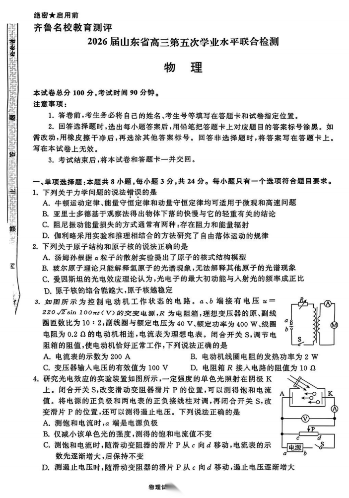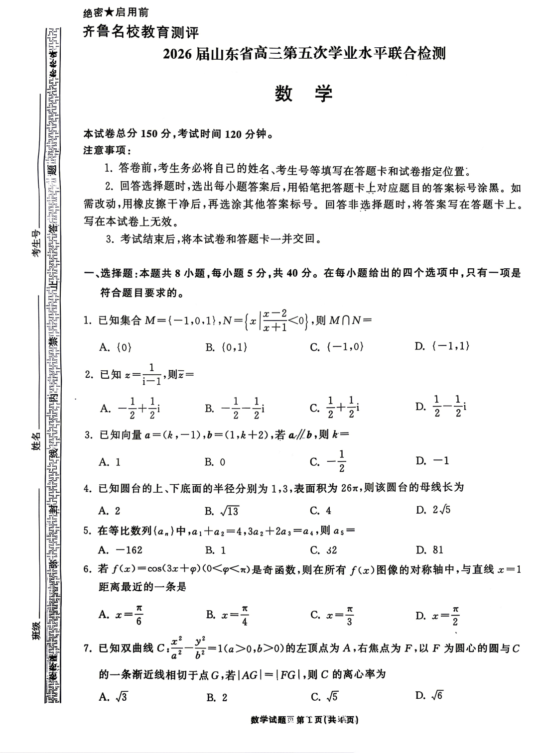【山东卷】山东省齐鲁名校教育测评大联考2026届山东省高三年级第五次学业水平联合检测((4.2-4.3) 数学物理语文试题卷+答案