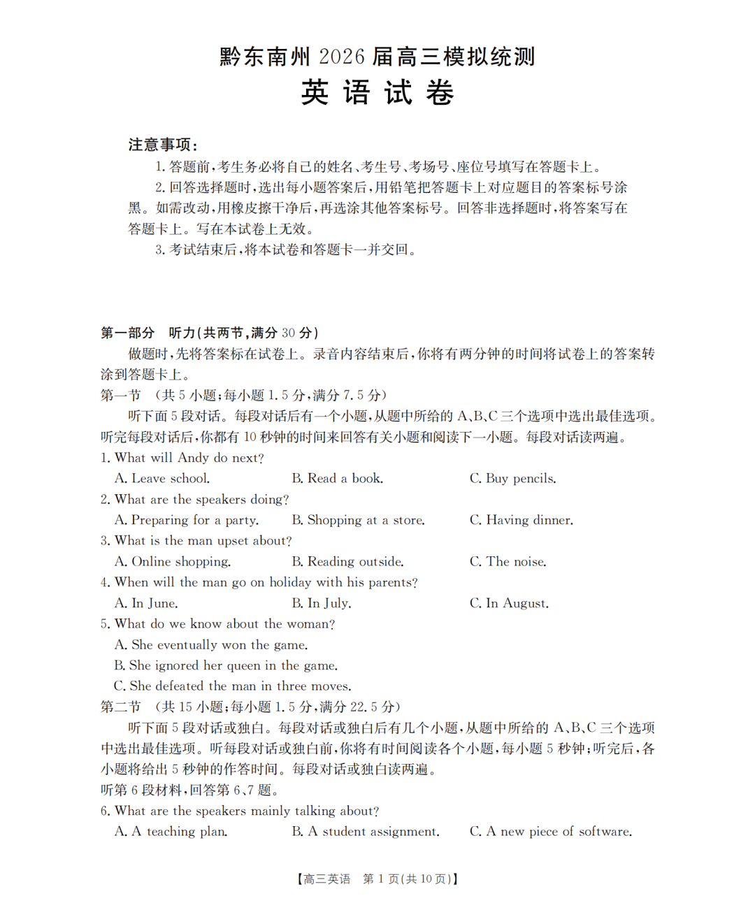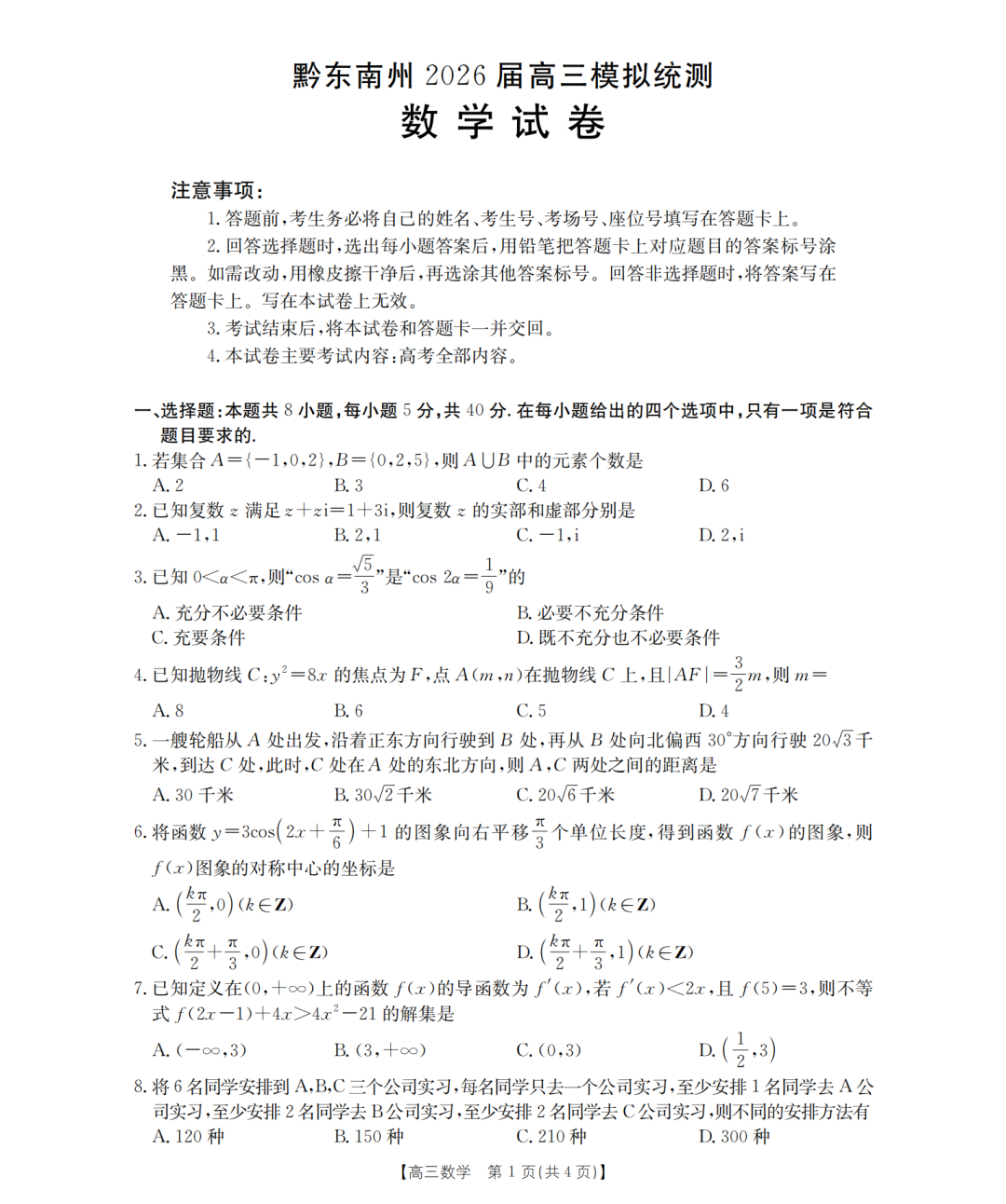 【贵州卷】贵州省黔东南、安顺、黔西南、铜仁、毕节五市州2026届高三下学期模拟统测(即贵州一模五市州版)(3.31-4.2)全科试题卷+答案