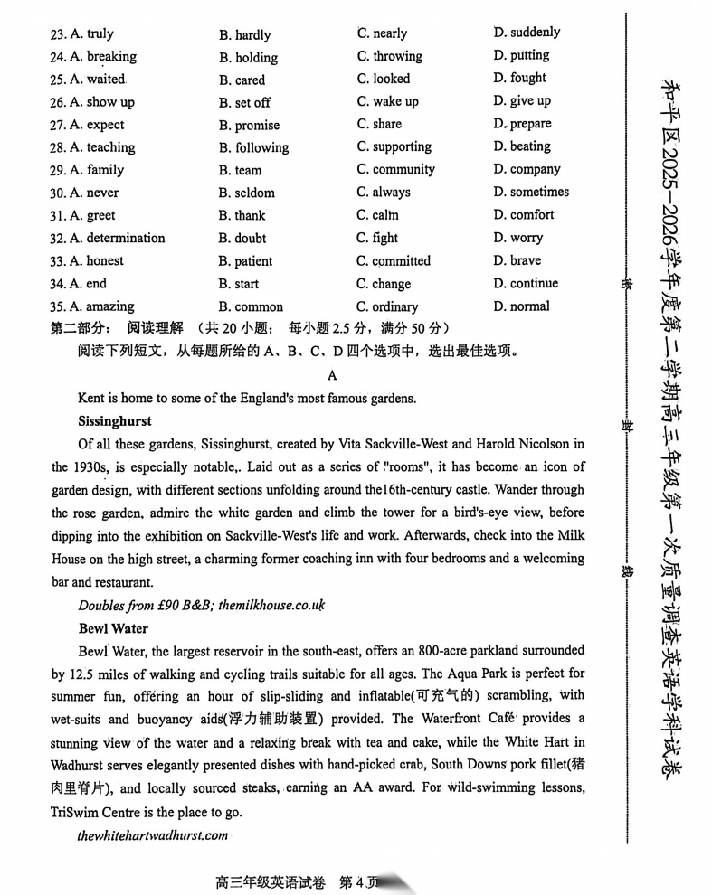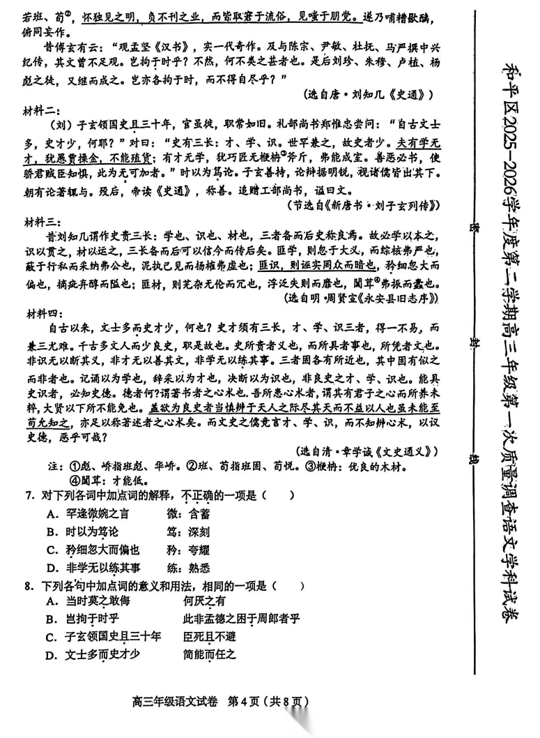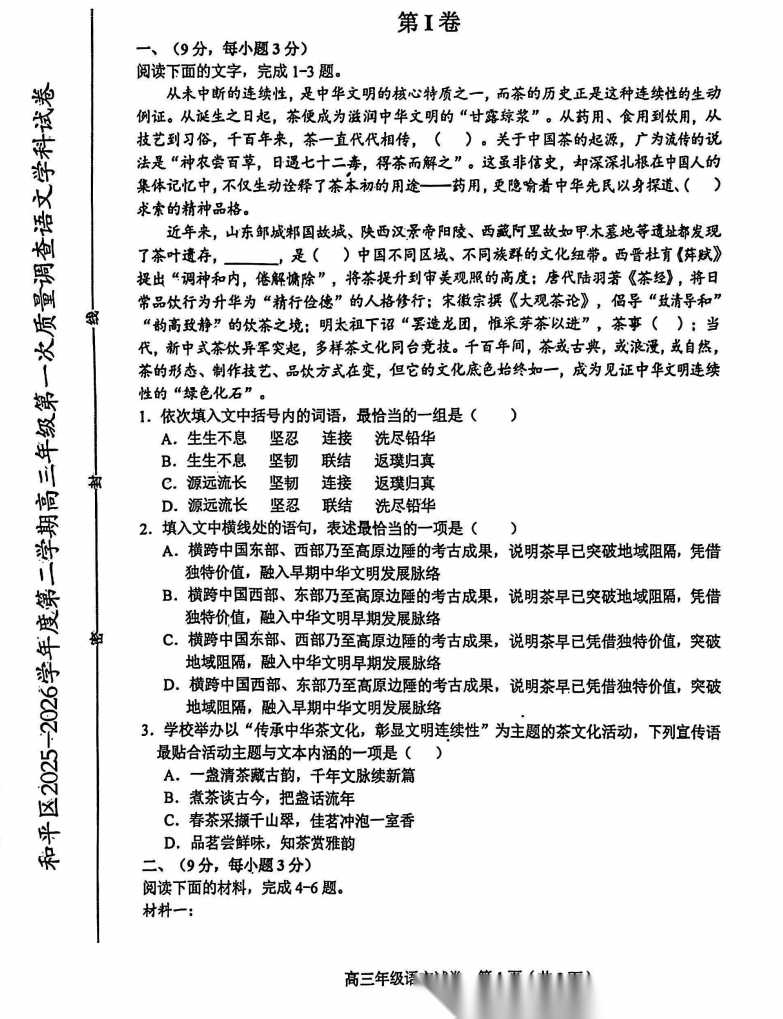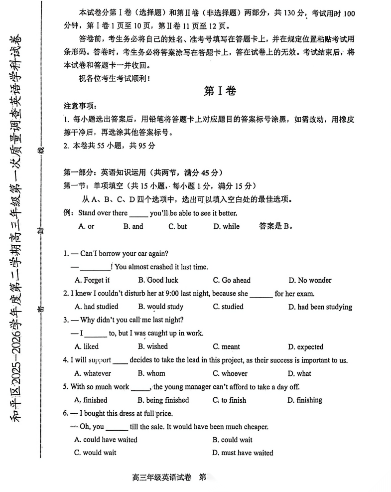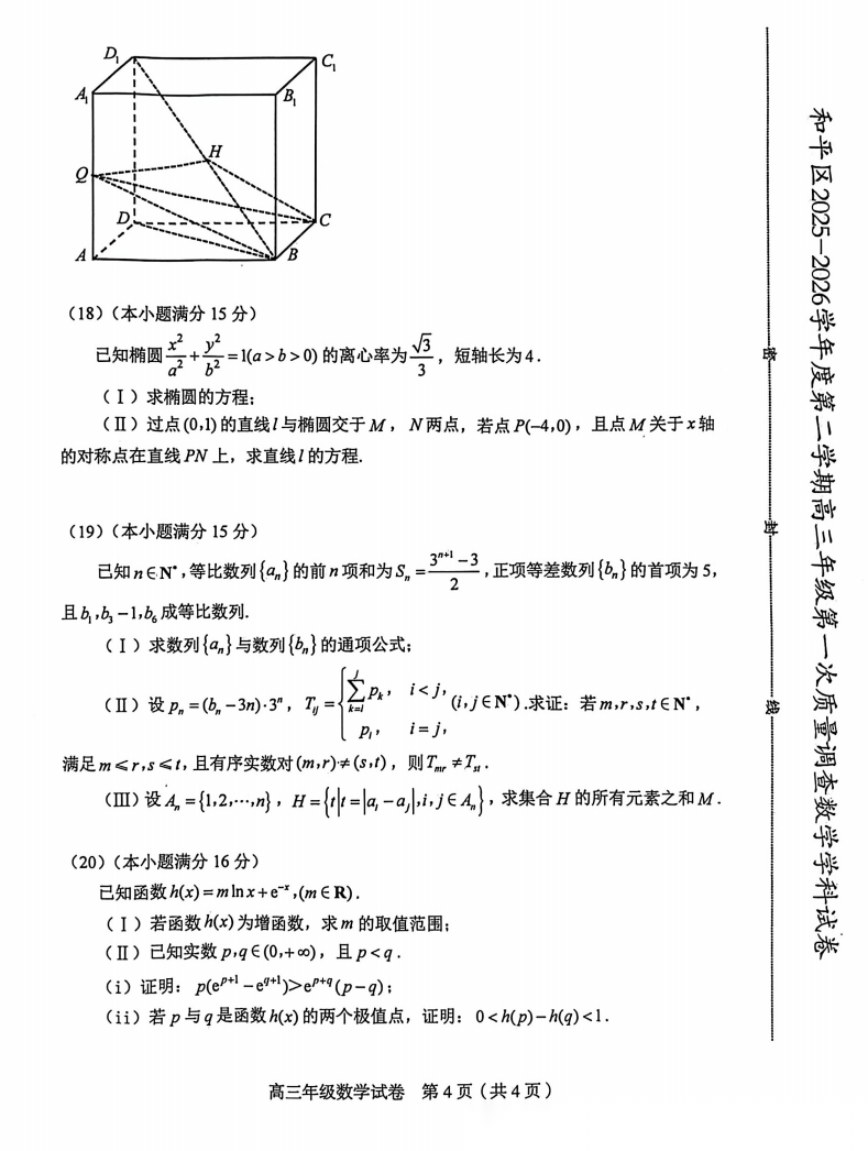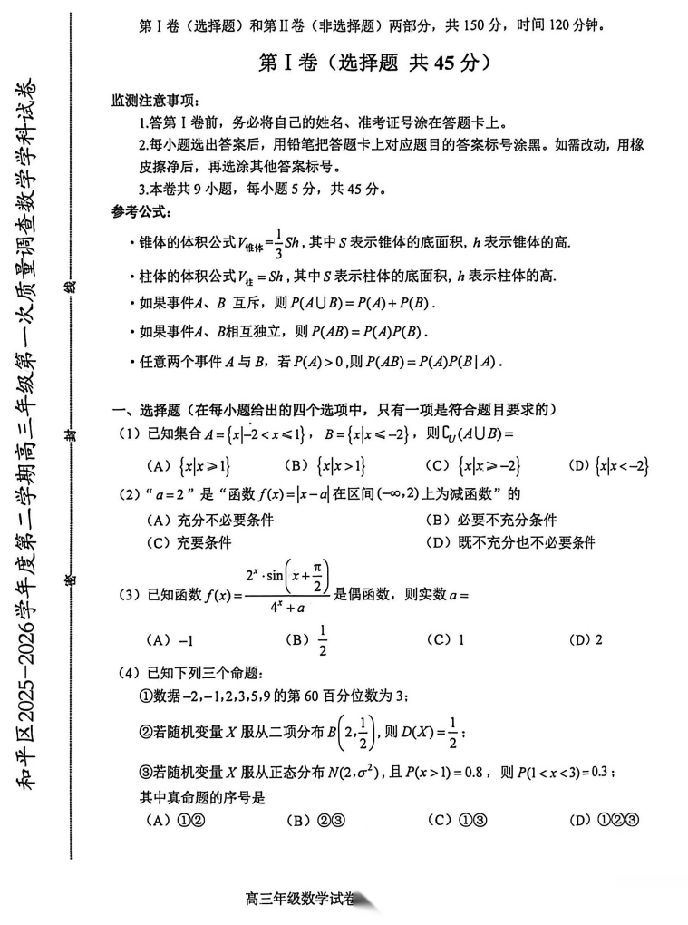 【天津卷】天津和平区2025-2026学年度第二学期高三年级第一次质量调查(和平高考一模)(3.25-3.26) 全科试题卷+答案