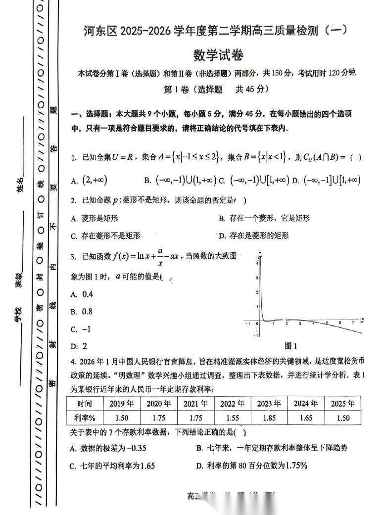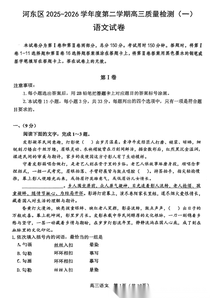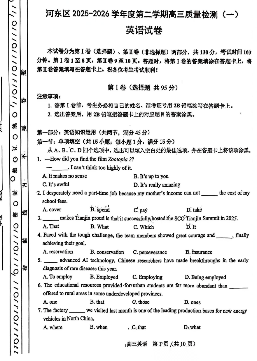 【天津卷】天津市河东区2025-2026学年度第二学期高三年级 质量检测(一)(河东一模)(3.10-3.11) 全科试题卷+答案