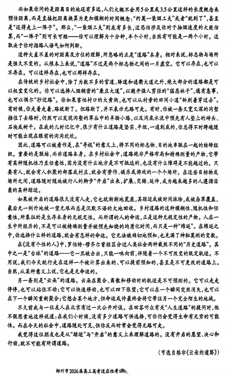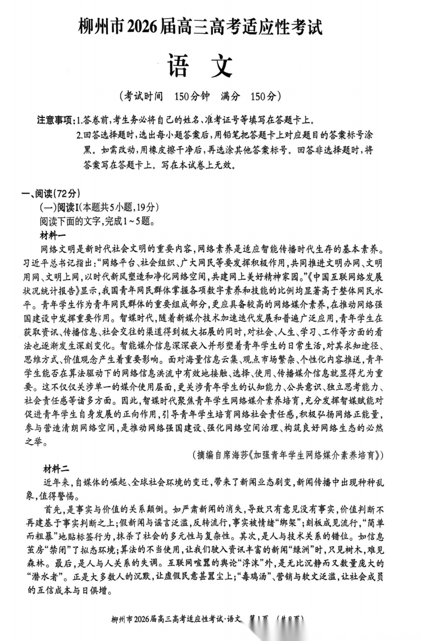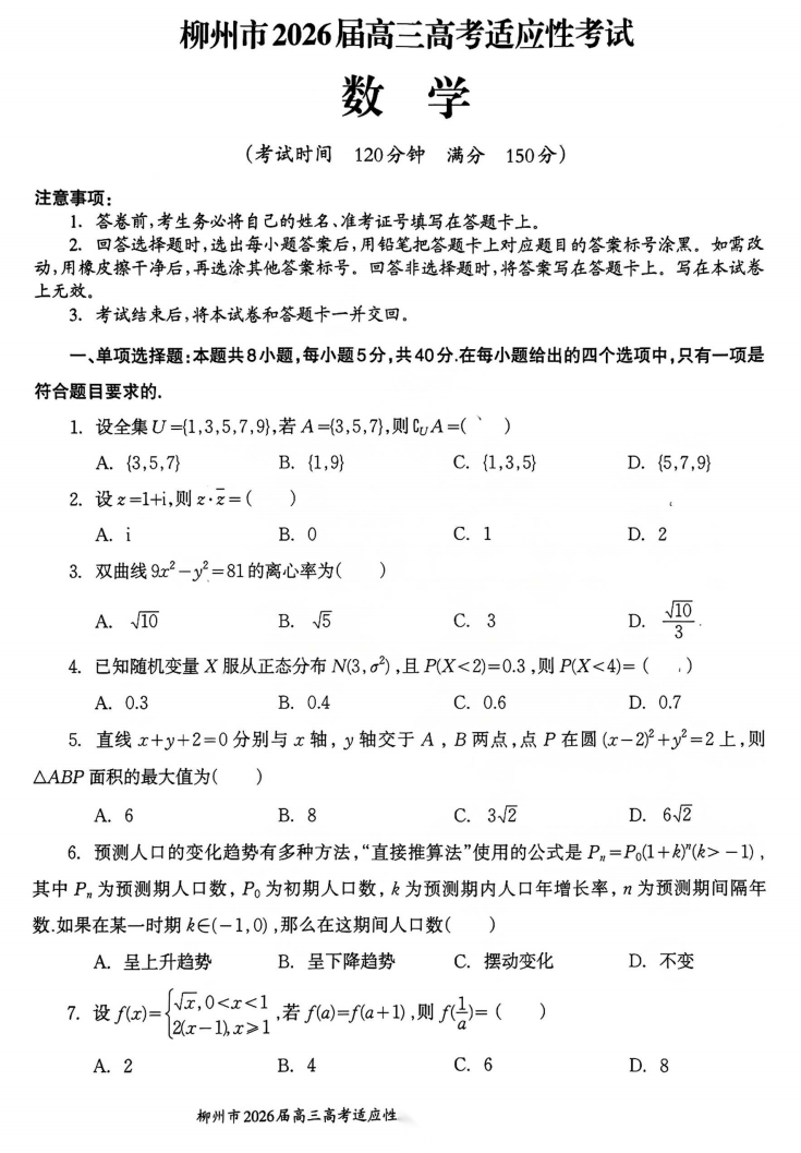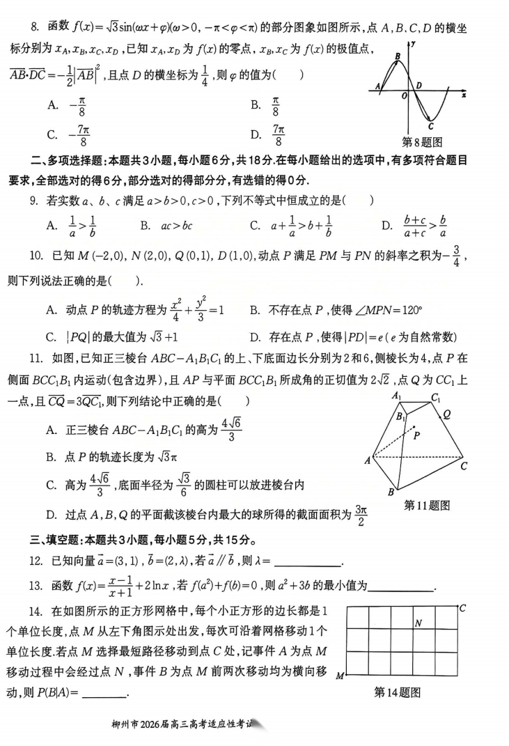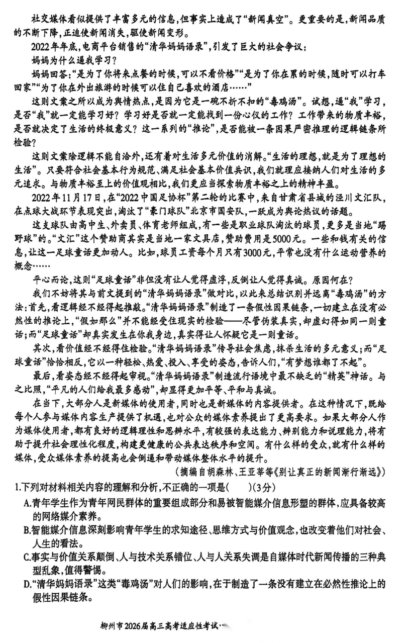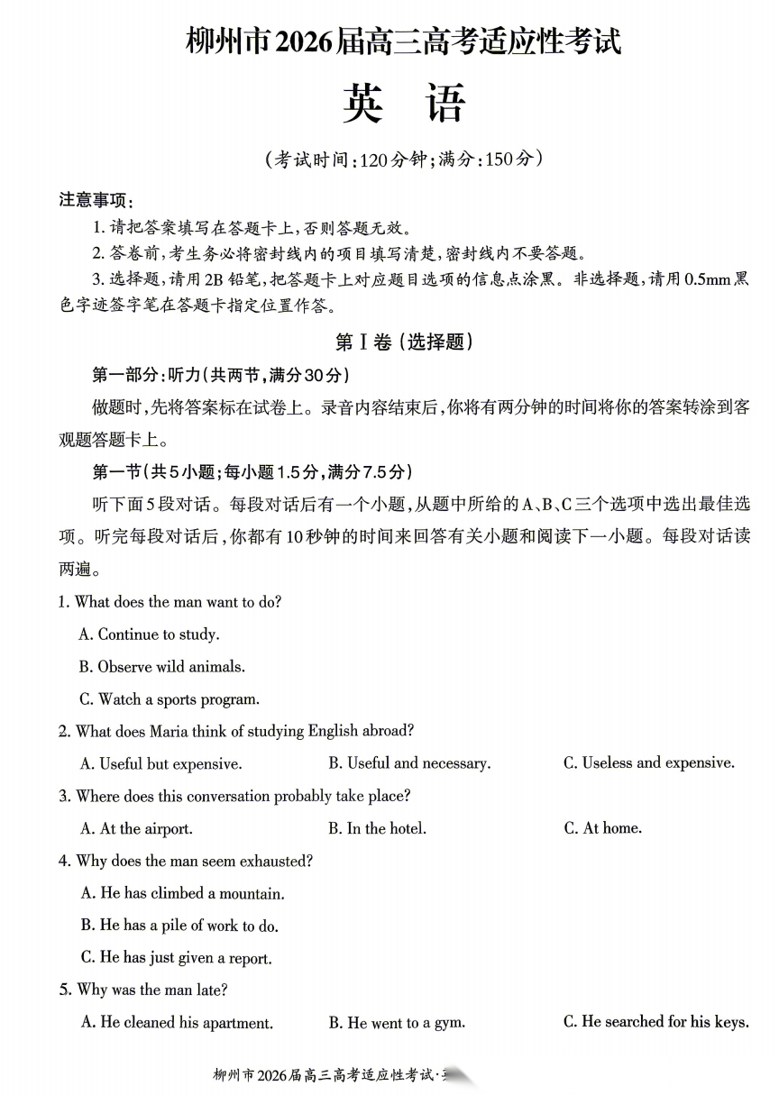 【广西卷】广西壮族自治区柳州市2026届高三年级3月末高考适应性考试(柳州三模)(3.30-3.31) 全科试题卷+答案