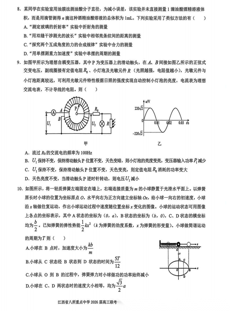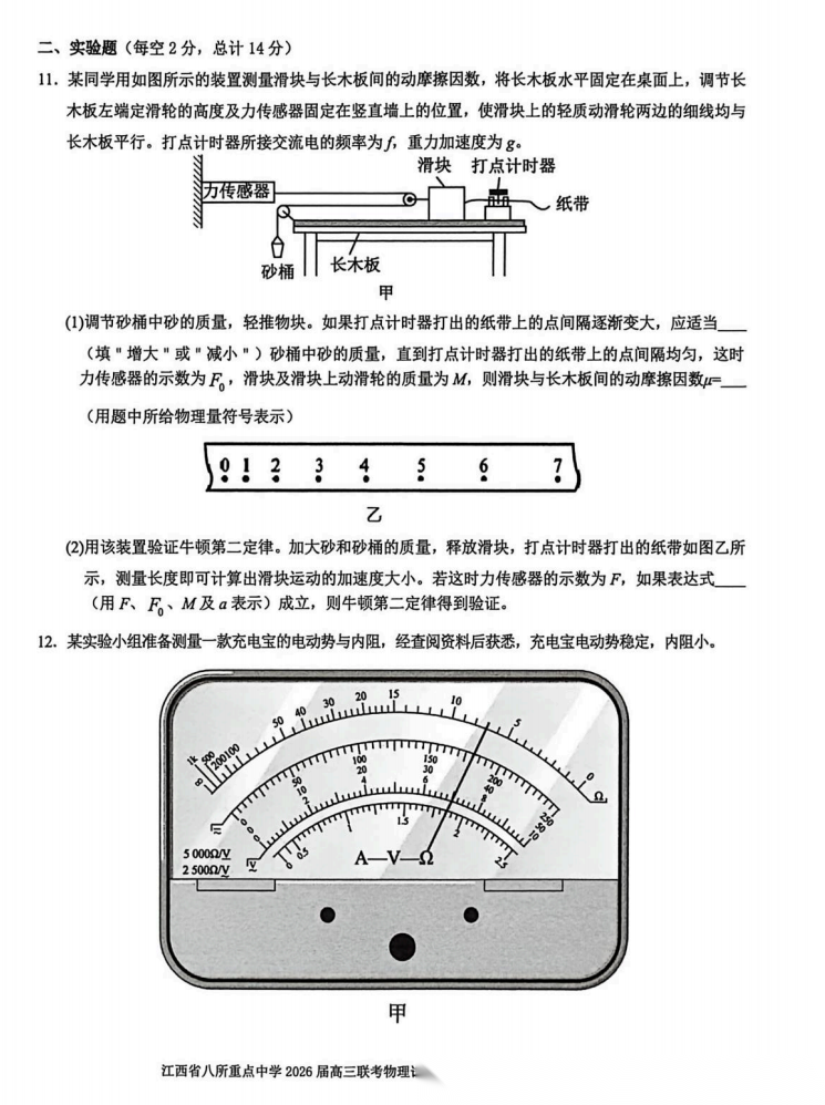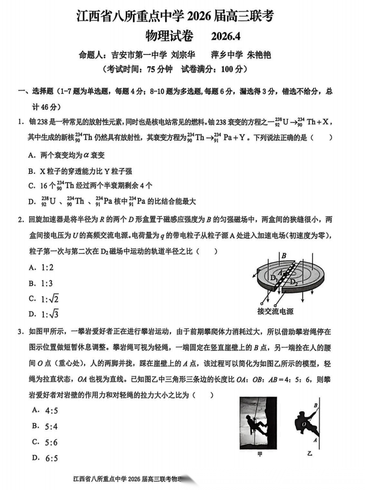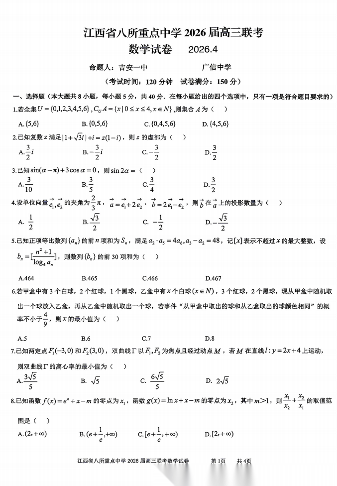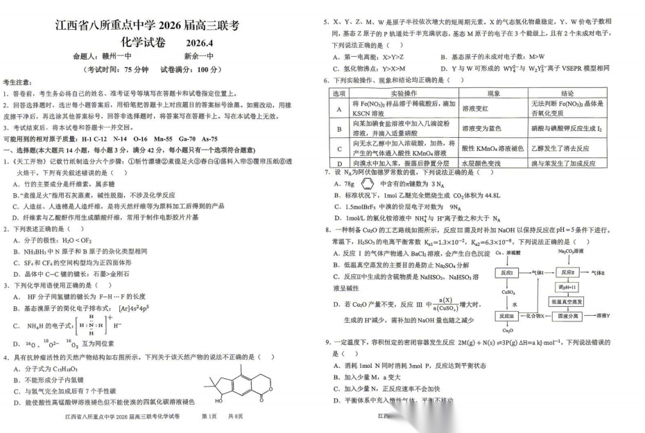 【江西卷】江西省八所重点中学(九江一中、宜春中学、临川一中、南昌二中等)2026届高三年级4月联考(4.1-4.2) 全科试题卷+答案