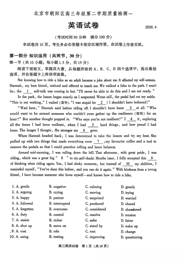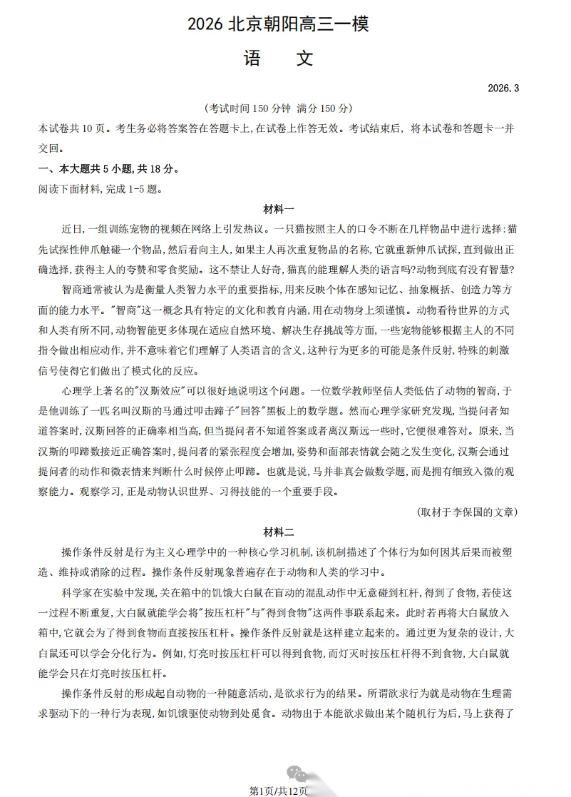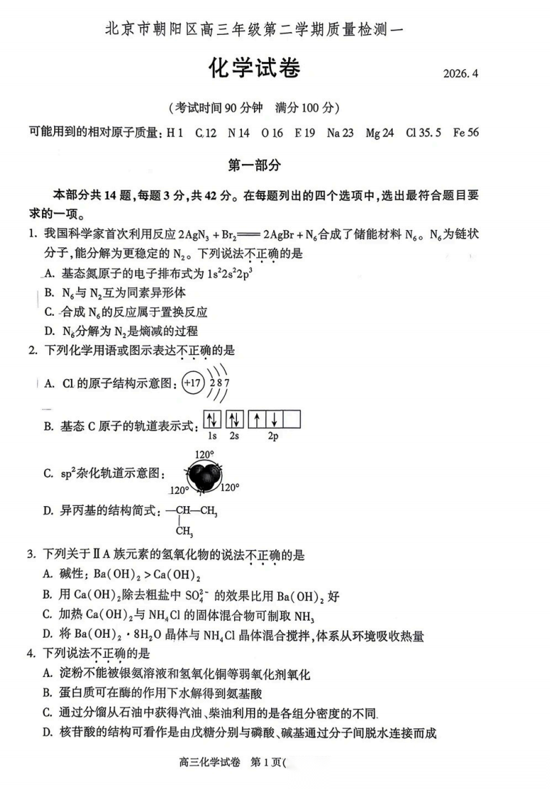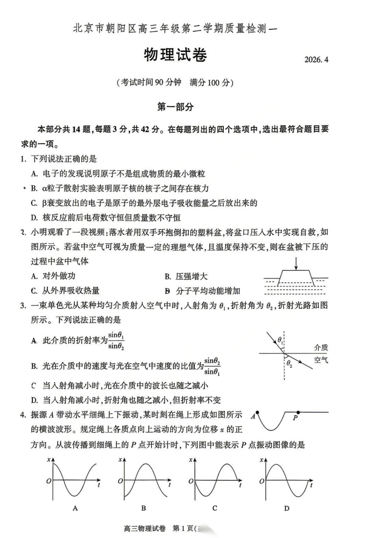 【北京卷】北京市朝阳区2025-2026学年度高三年级第二学期质量检测一(朝阳一模)(3.31-4.3)数学物理化学语文政治试题卷+答案