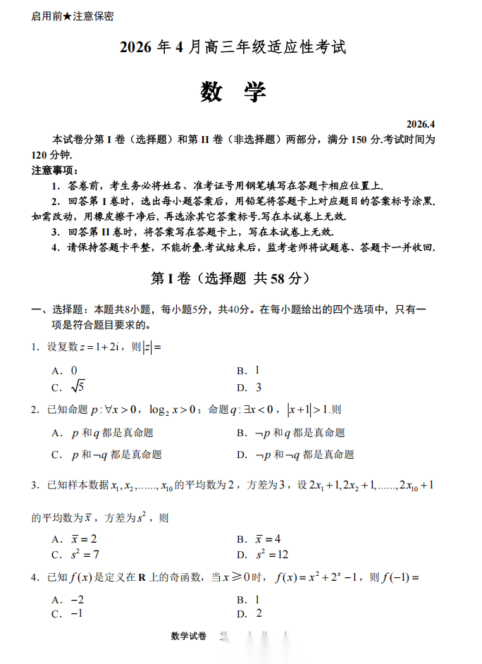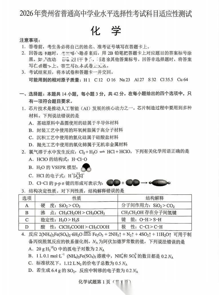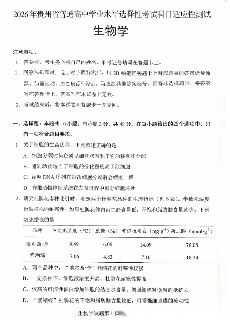 【贵州卷】贵州省2026年4月高三年级适应性考试(贵州一模)(3.31-4.1) 数学化学生物语文地理政治试题卷+答案