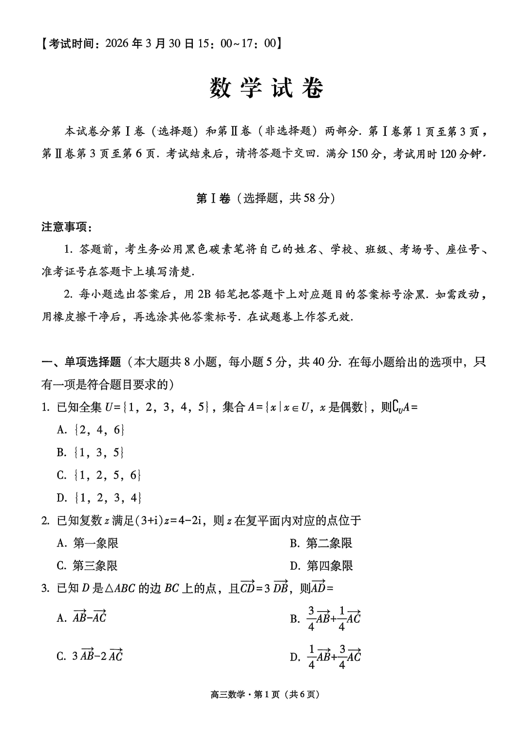 【补齐重发】【四川卷】四川省南充市高2026届高三高考适应性考试(二诊)(南充二诊)(3.30-4.1) 全科试题卷+答案 【补齐重发】【四川卷】四川省南充市高2026届高三高考适应性考试(二诊)(南充二诊)(3.30-4.1) 全科试题...