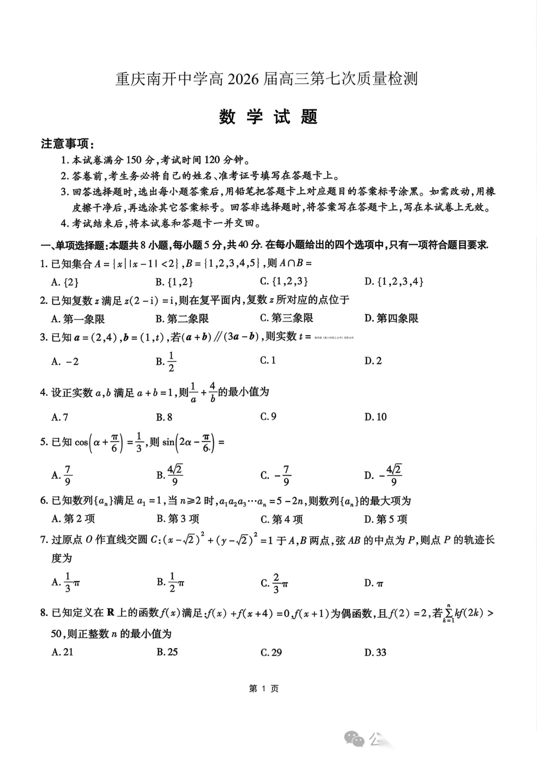 重庆南开中学高2026届高三第七次质量检测全科下载