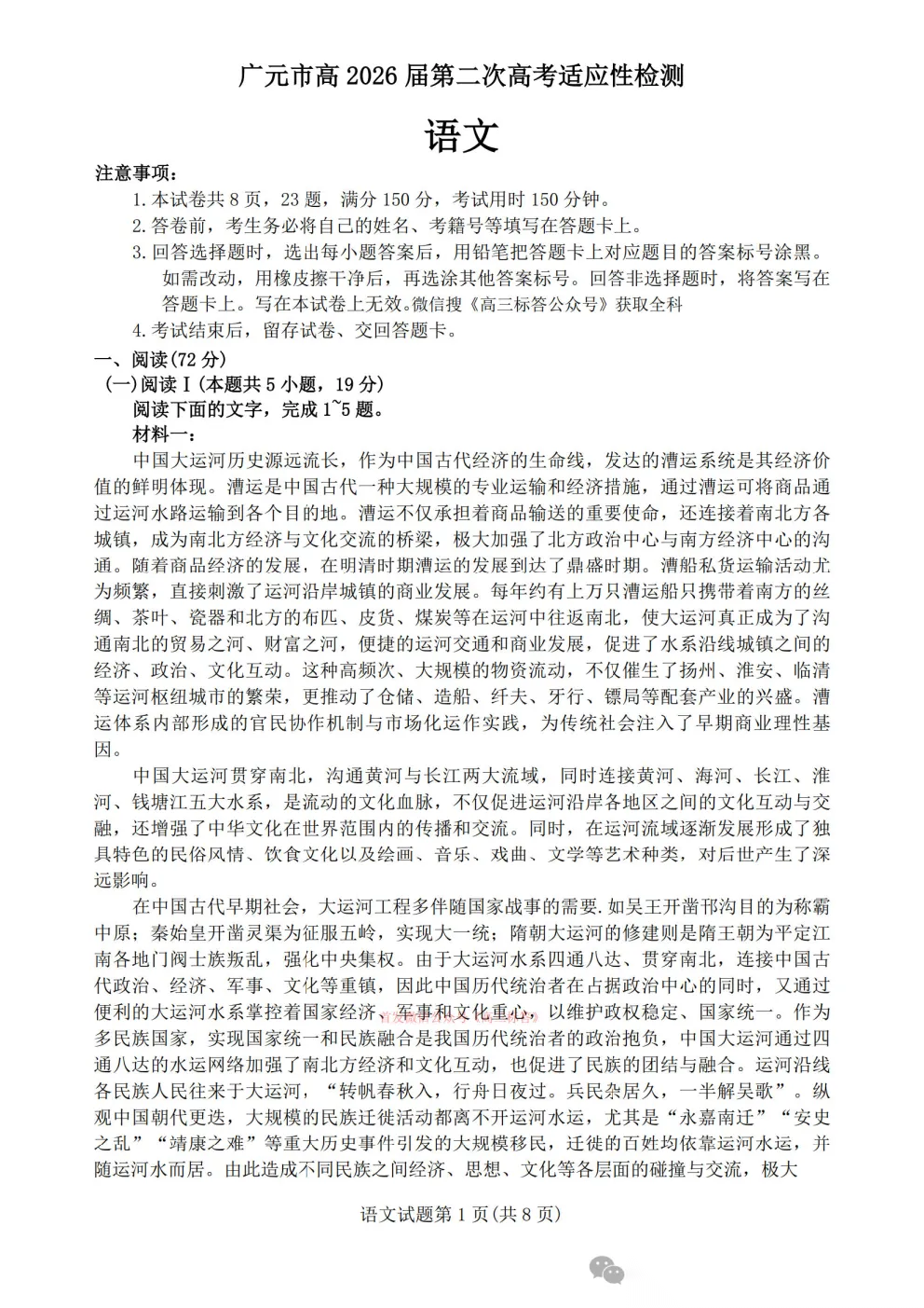 【广元二模】广元市高2026届第二次高考适应性检测全科下载