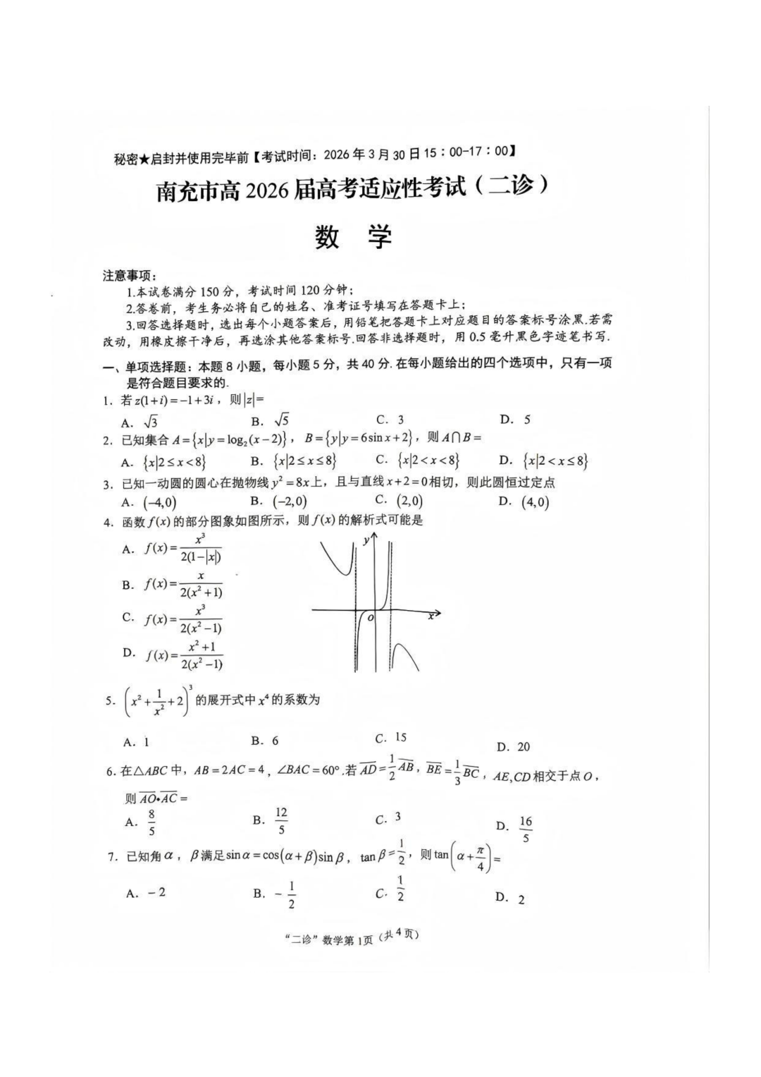 四川省南充市高2026届高三3月高考适应性考试(南充二诊)