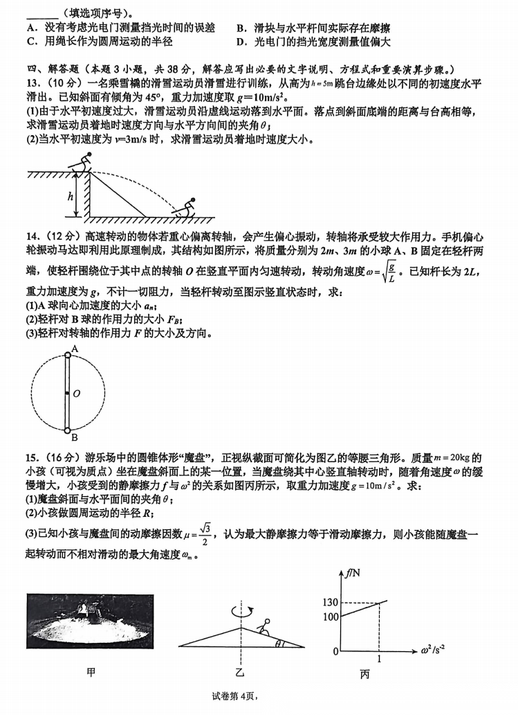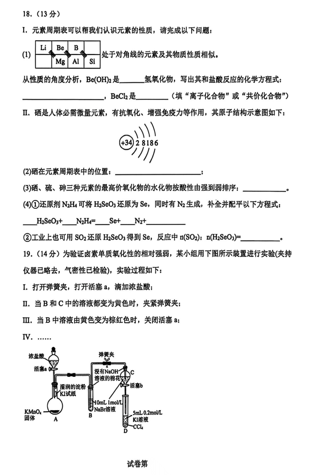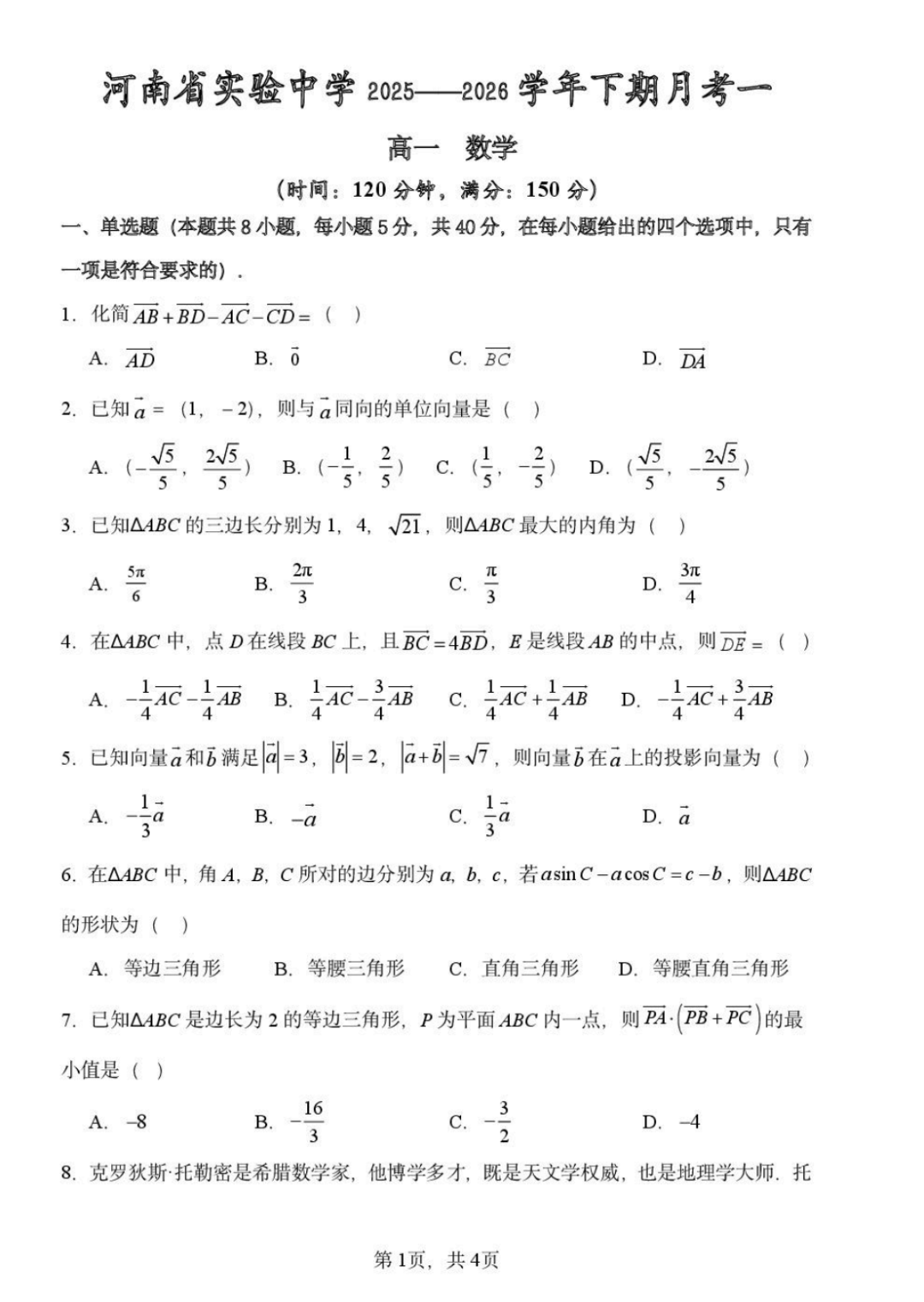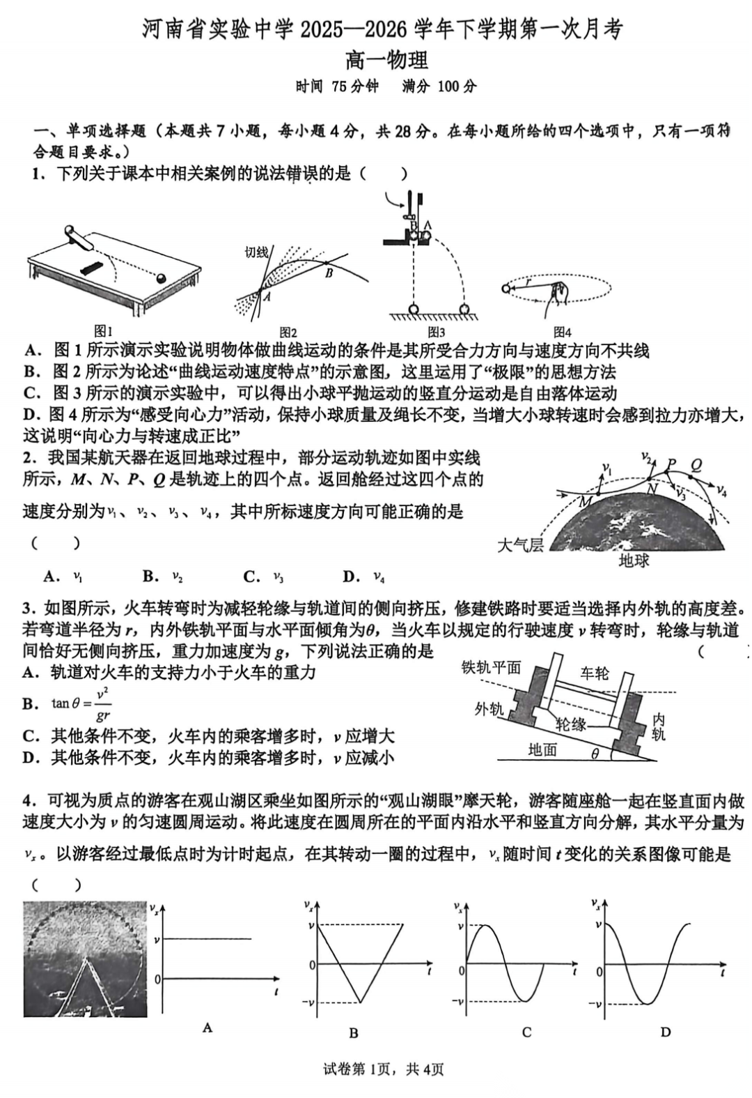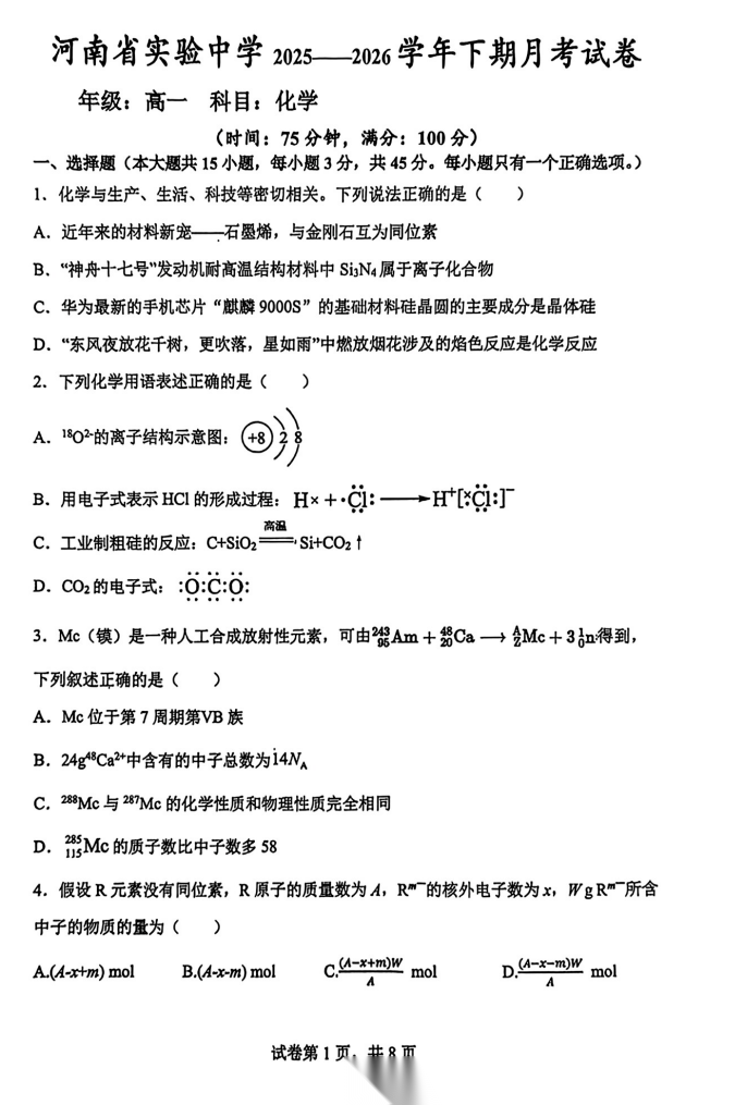 【百强校】【河南卷】河南省河南实验中学2025-2026学年下期高一年级月考卷(一)(3月底) 数学物理化学试题卷+答案